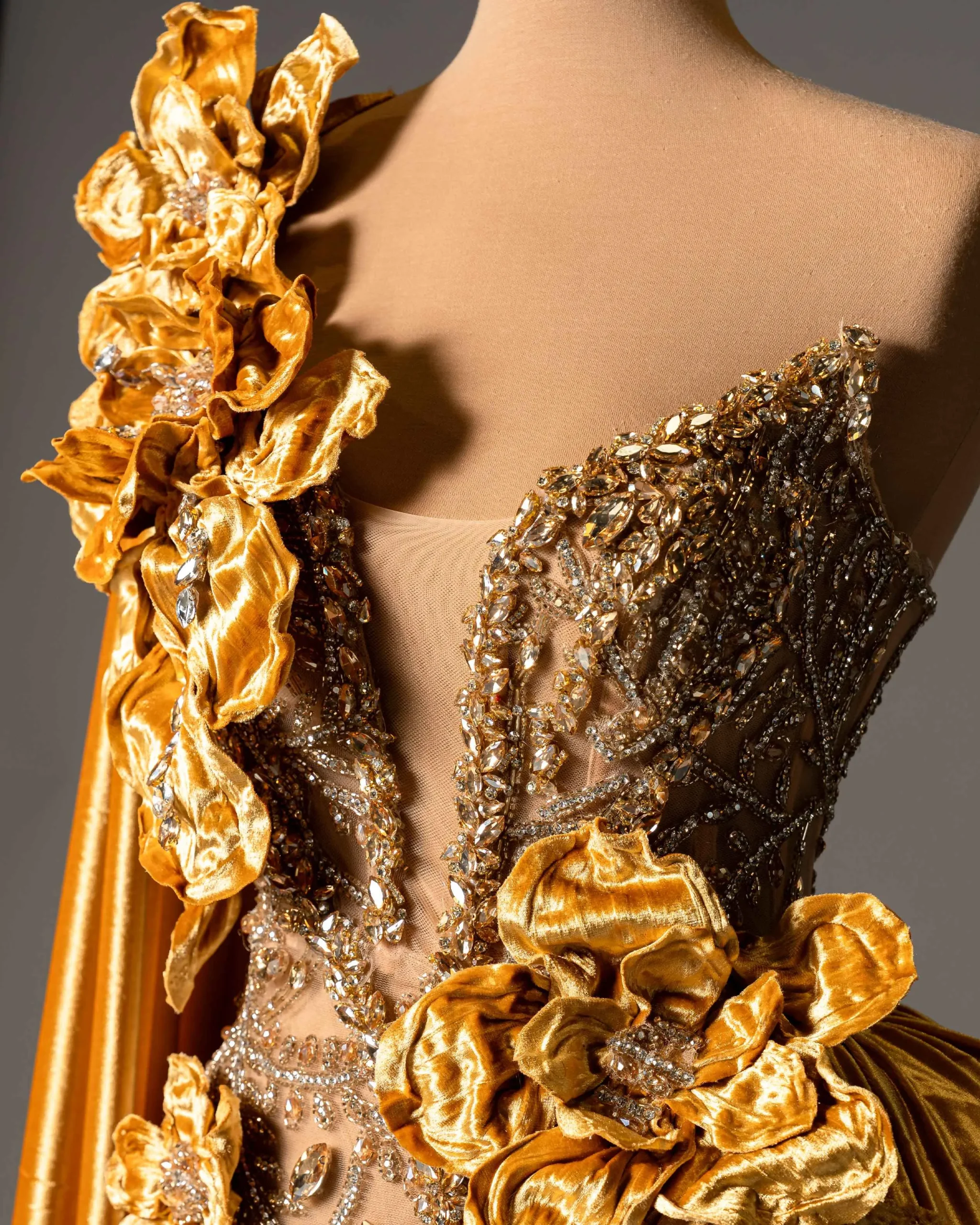 Handcrafted 3D floral appliqués in metallic gold tones,Luxurious velvet drape with a dramatic train,Sheer illusion bodice adorned with intricate beadwork and crystals,Asymmetric design combining elegance and bold femininity