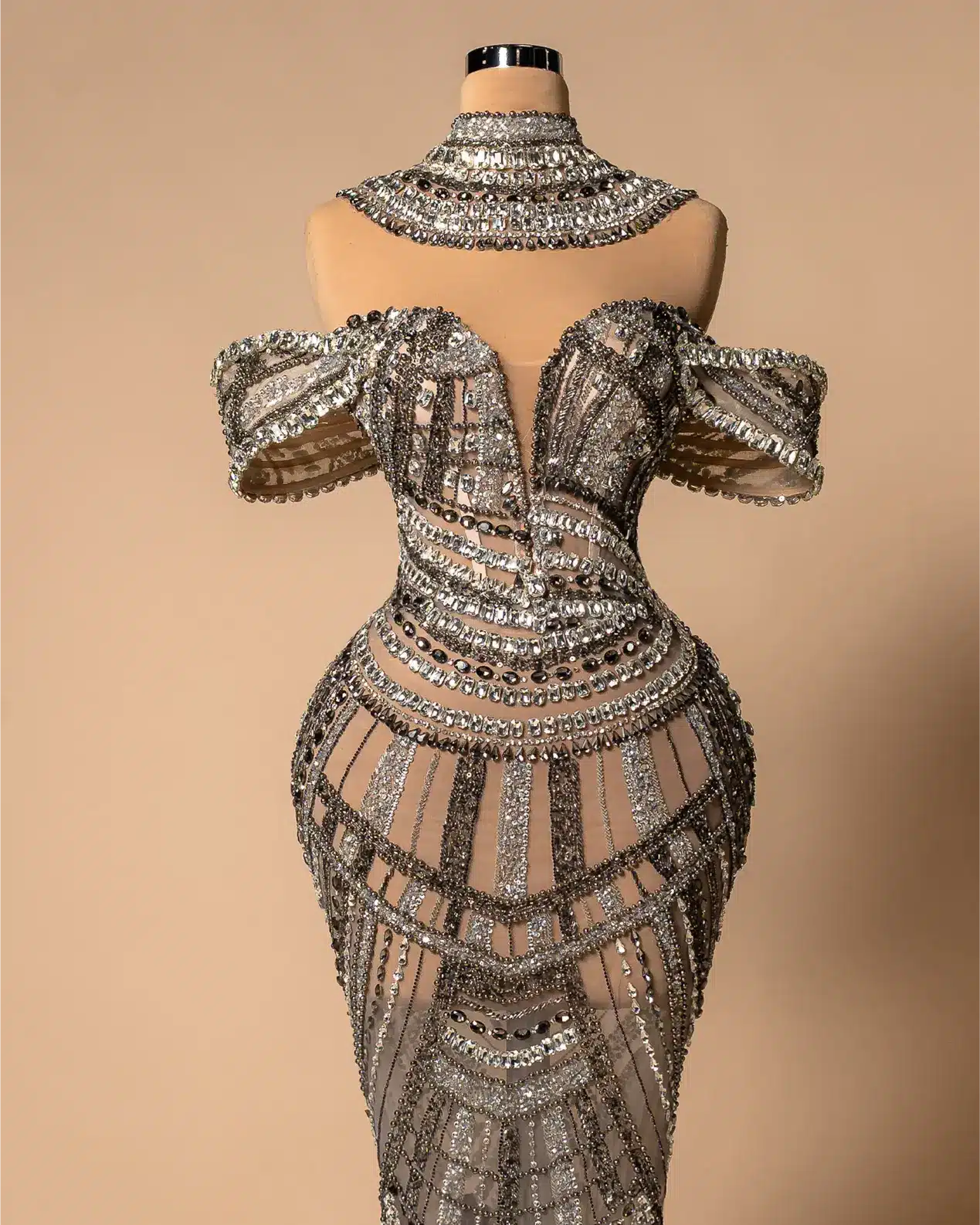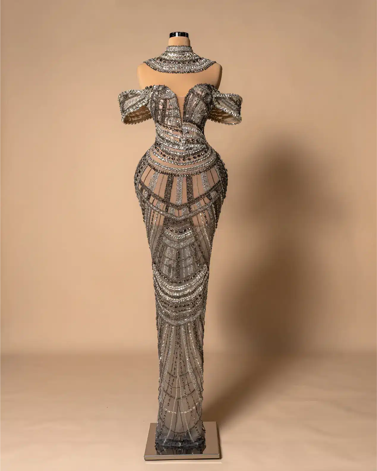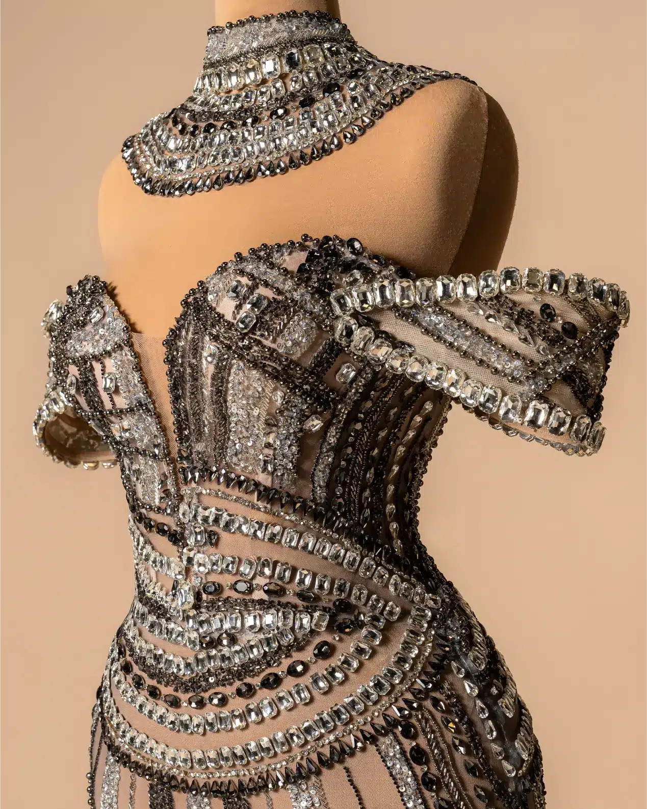 smoke-colored dress,stones in shades of smoke,black,white and blue,separated corset design for a unique look,handcrafted neckline,elegant with artisnal details