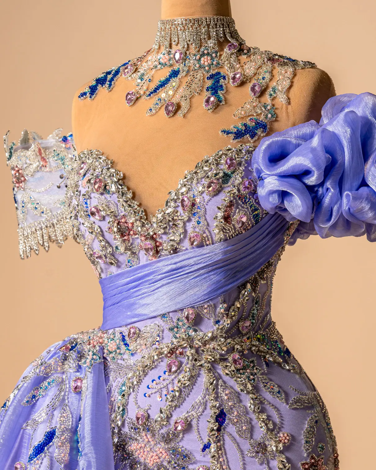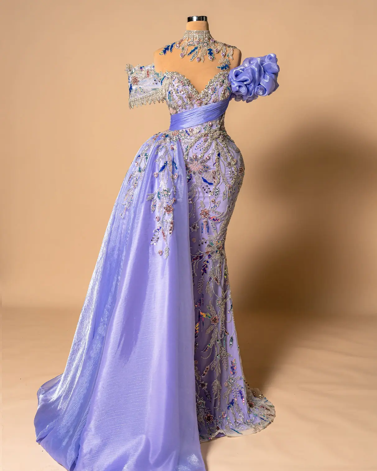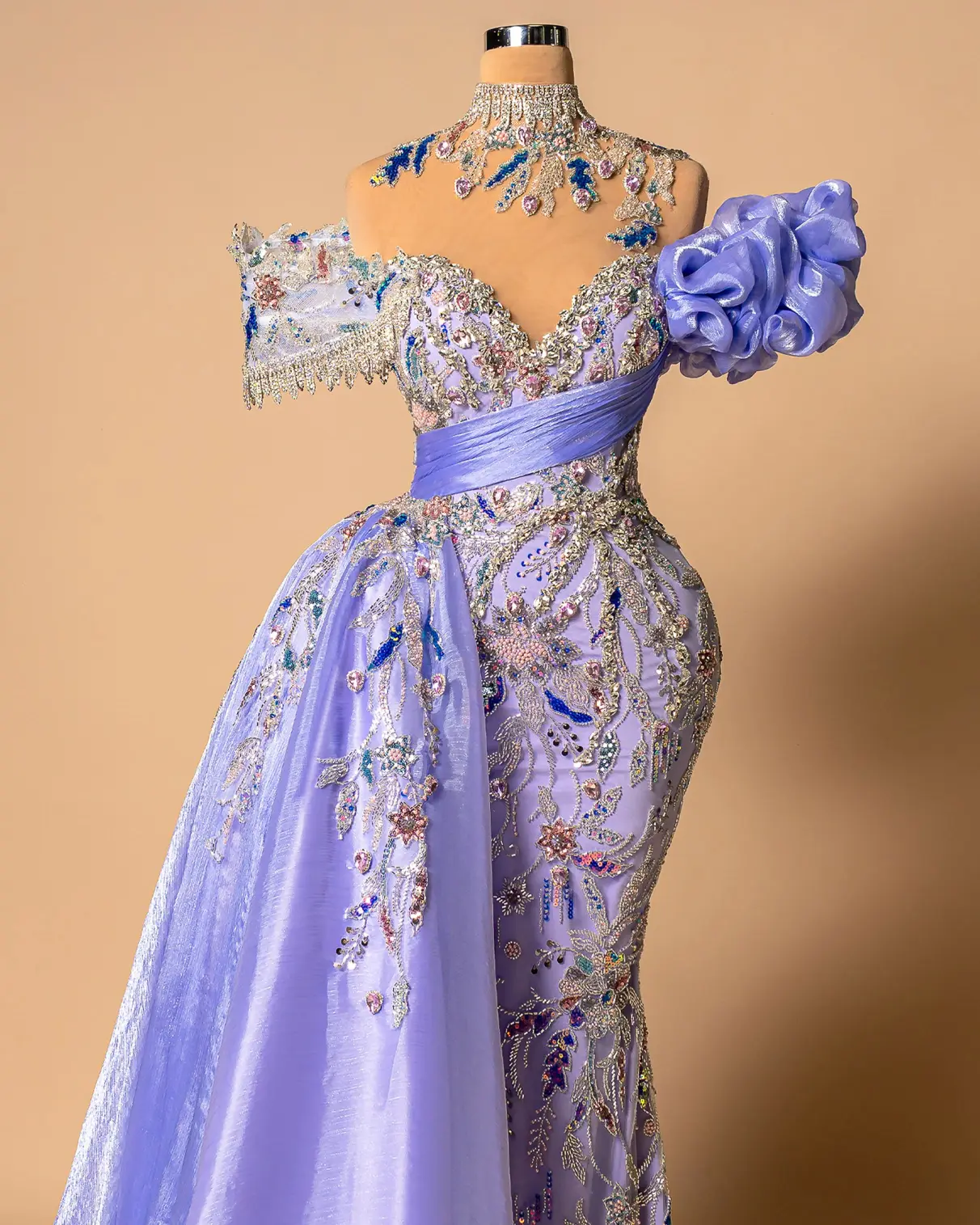 ermaid-style formal gown with a high, embellished collar and a ruched bodice,Lilac, with multi-colored floral appliqués and beading,Illusion sweetheart neckline, off-the-shoulder ruffle sleeve, a large floral accent on the shoulder, and a detachable overskirt or train