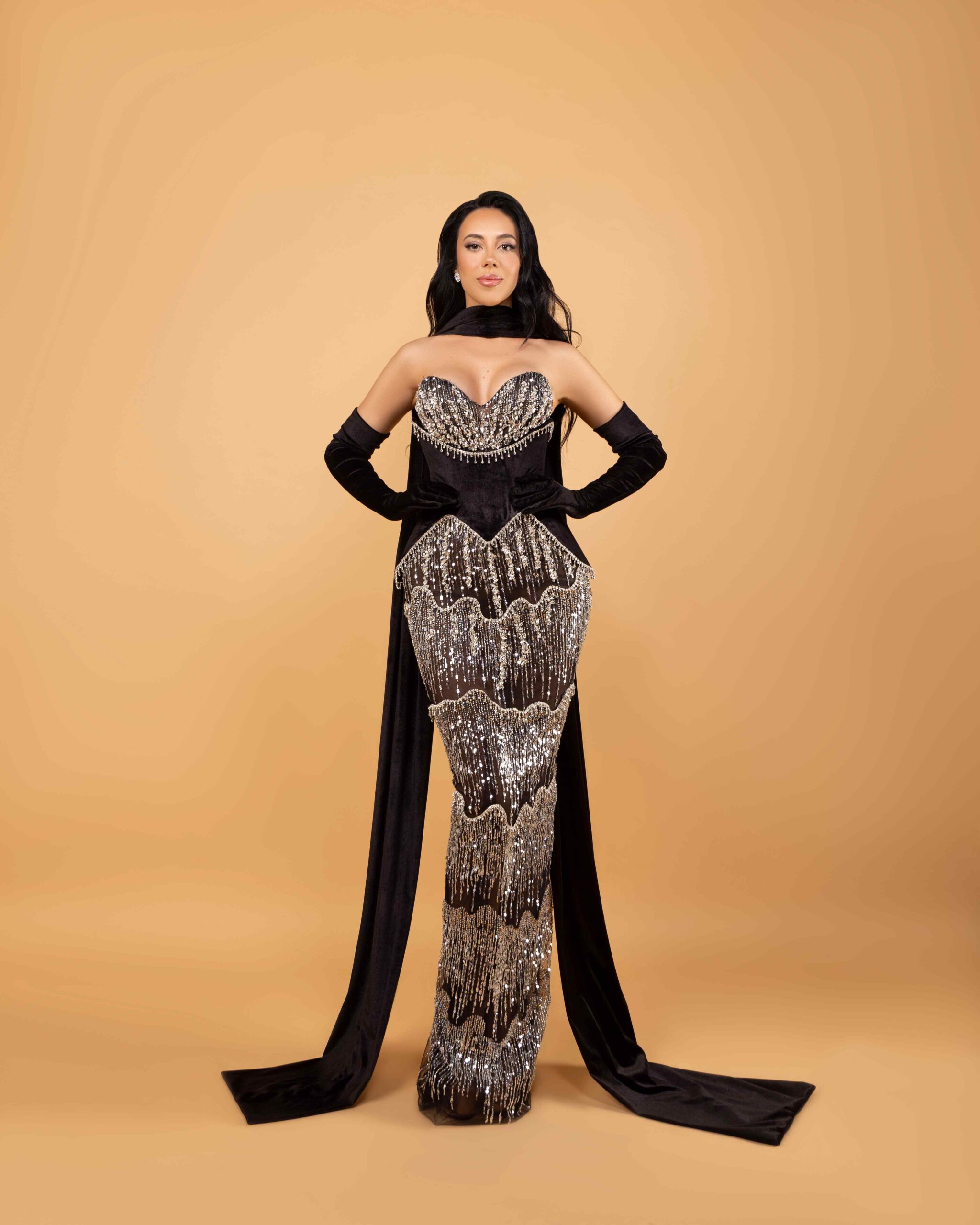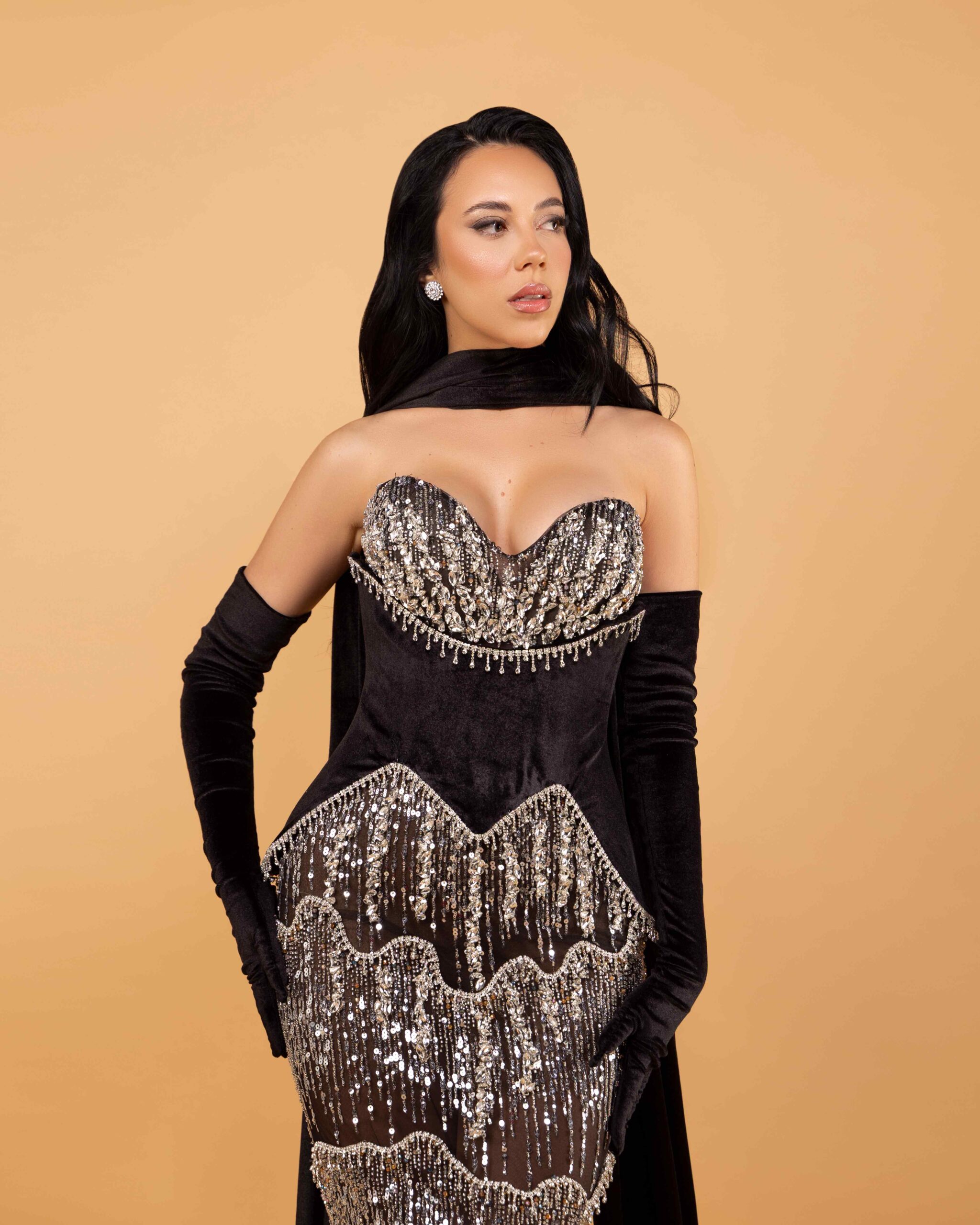 Turn heads with this luxurious black velvet dress, designed with a fitted corset adorned in dazzling silver stones. The delicate scarf adds a touch of sophistication, while the soft glow enhances your elegance. Ideal for evening parties, special occasions, or a glamorous night out.