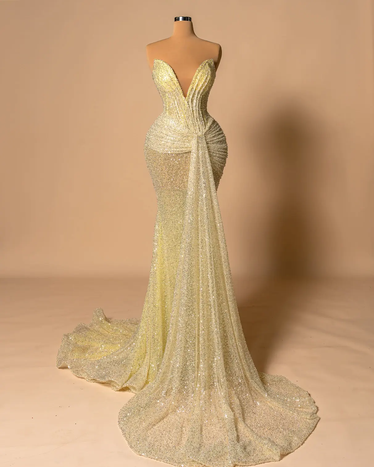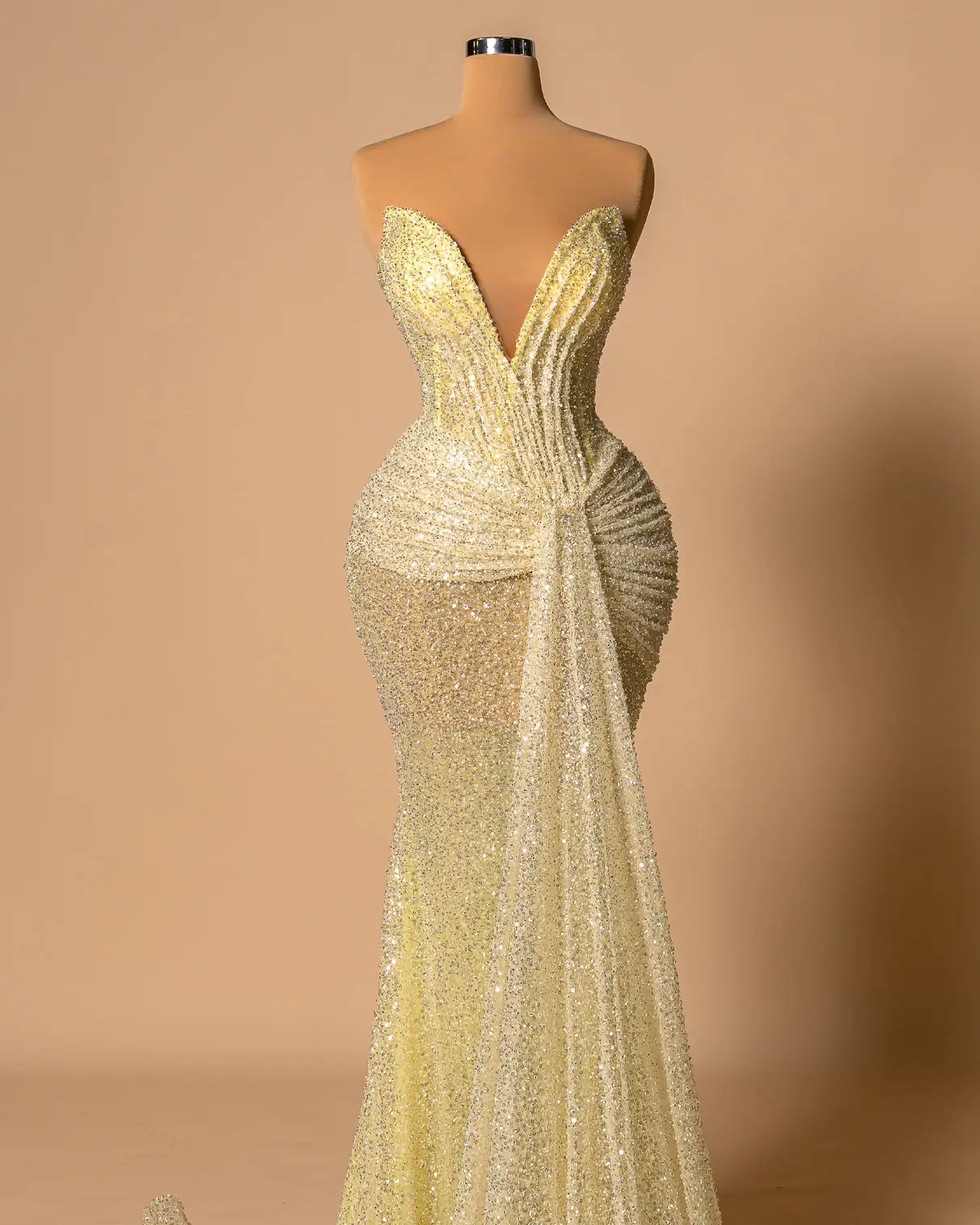 Yellow fabric, draped corset and on hips also, cape that flows from the front.