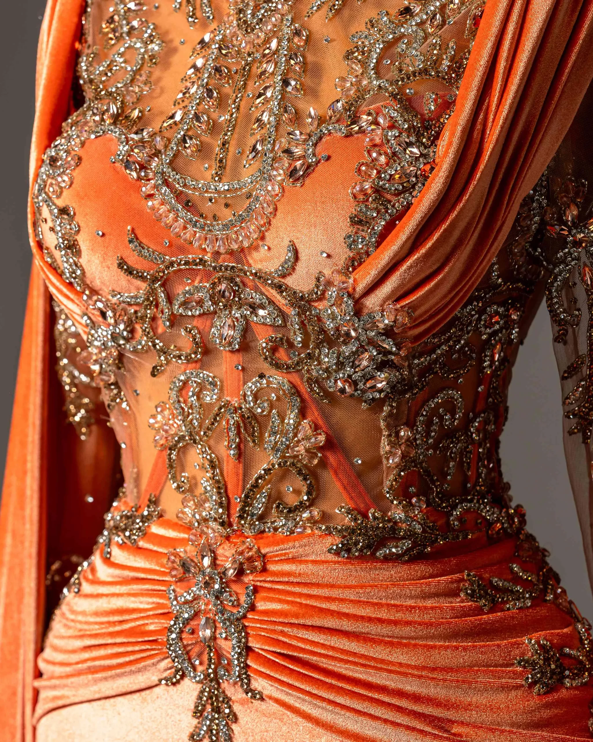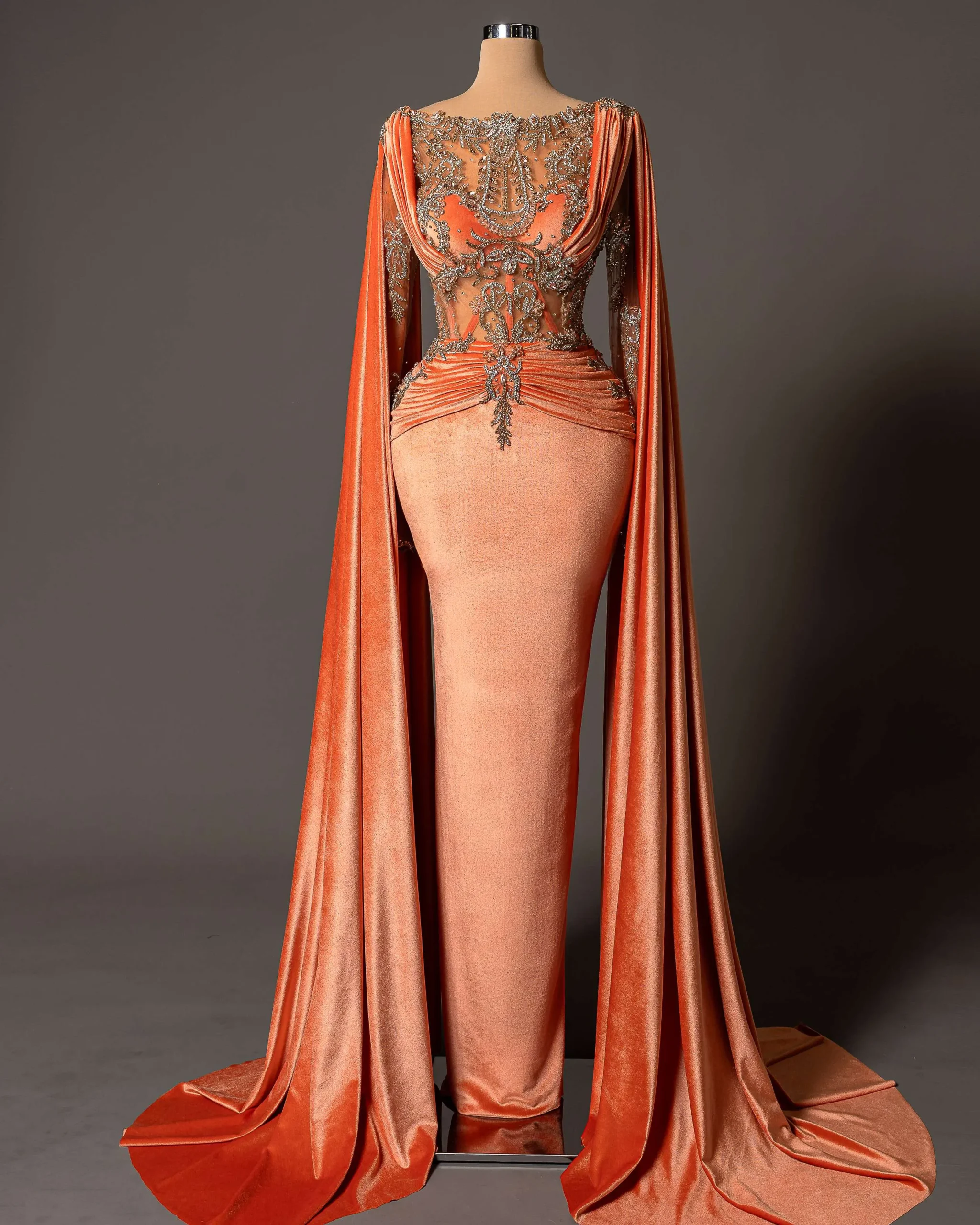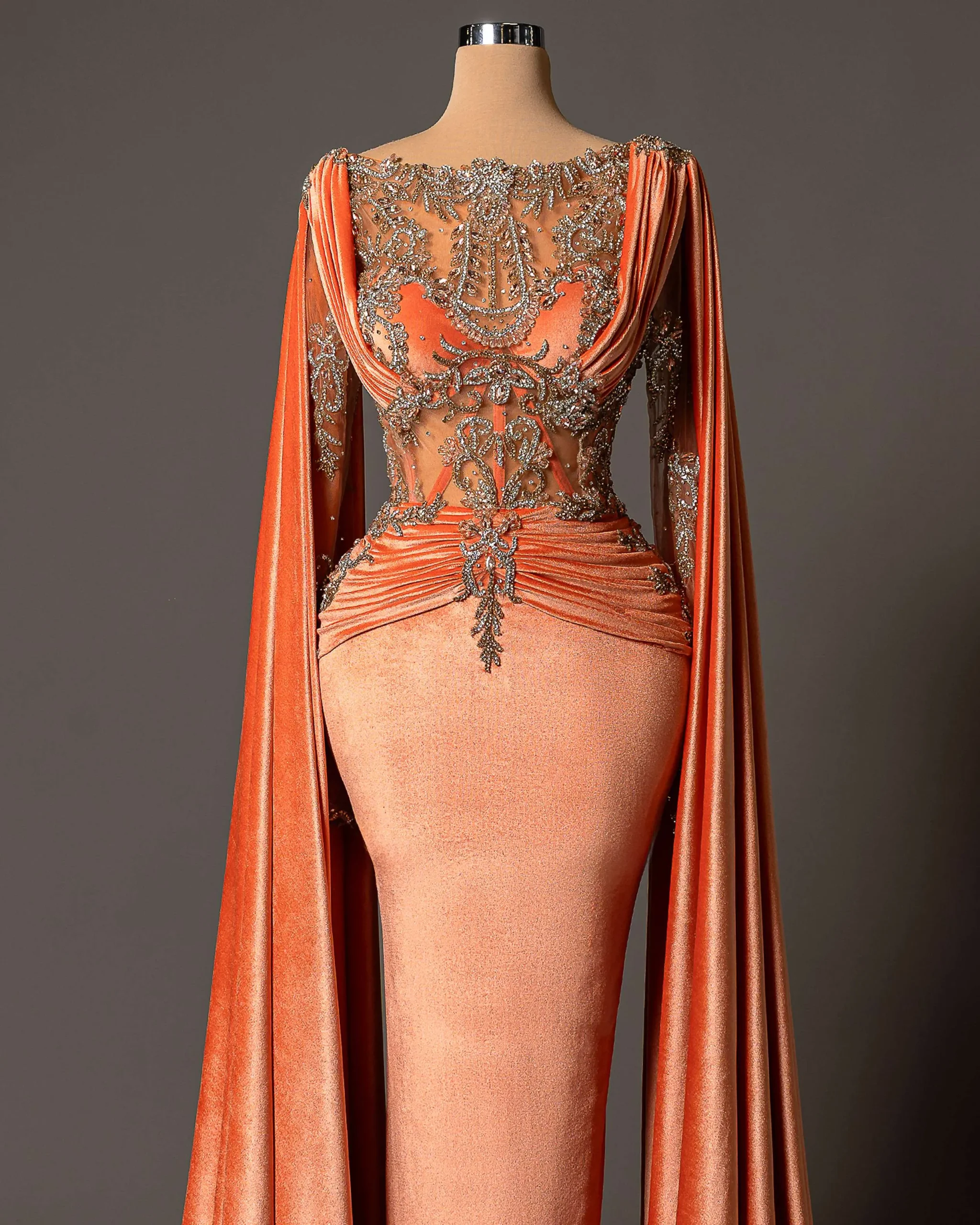 The fitted silhouette is complemented by the flowing cape sleeves, adding a royal and powerful touch.