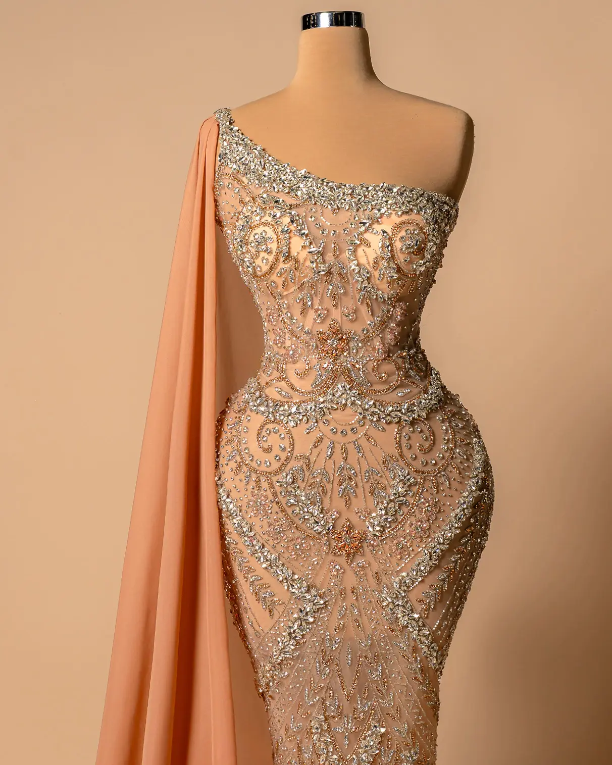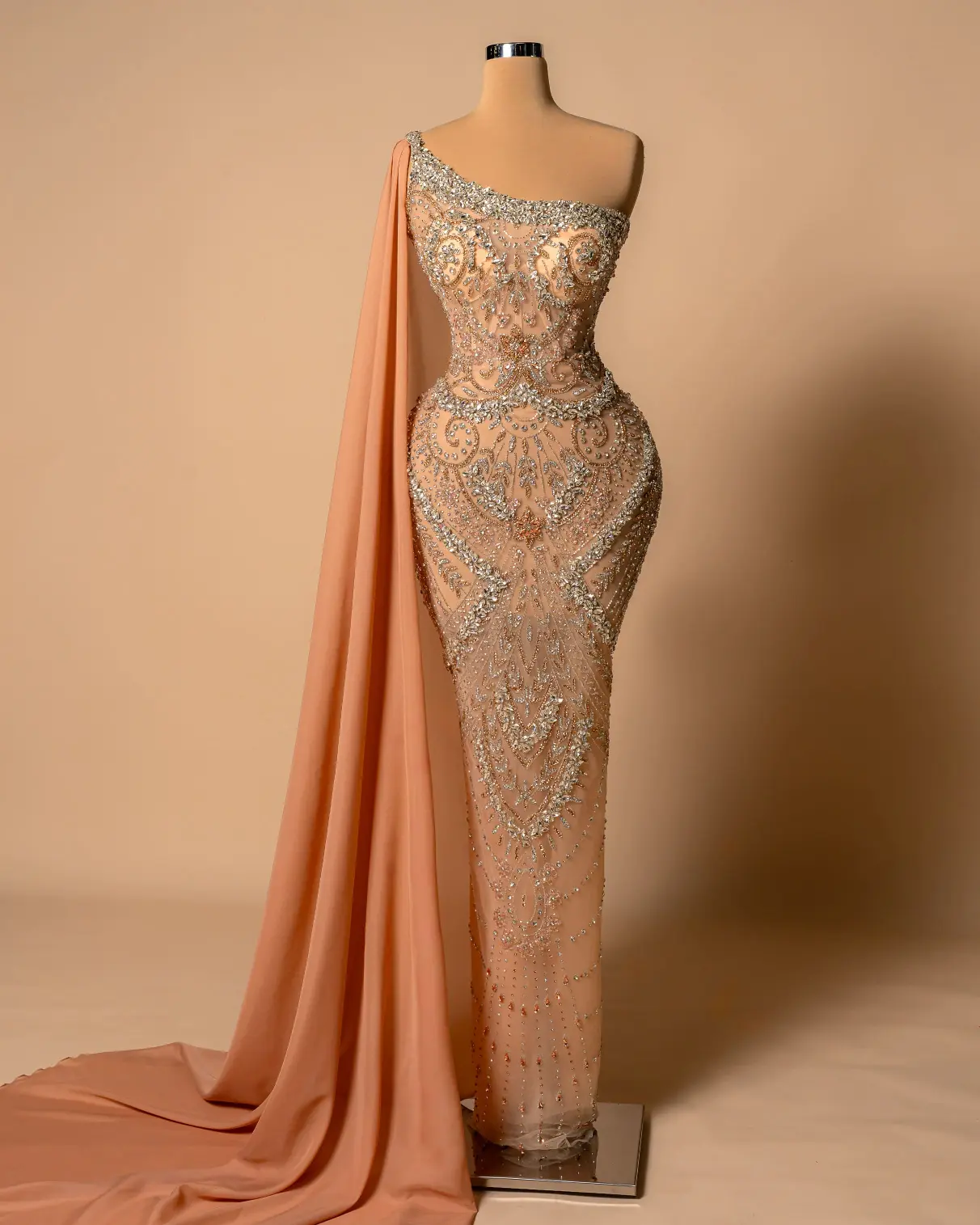 * Detail: long cape that softly flows to the floor”