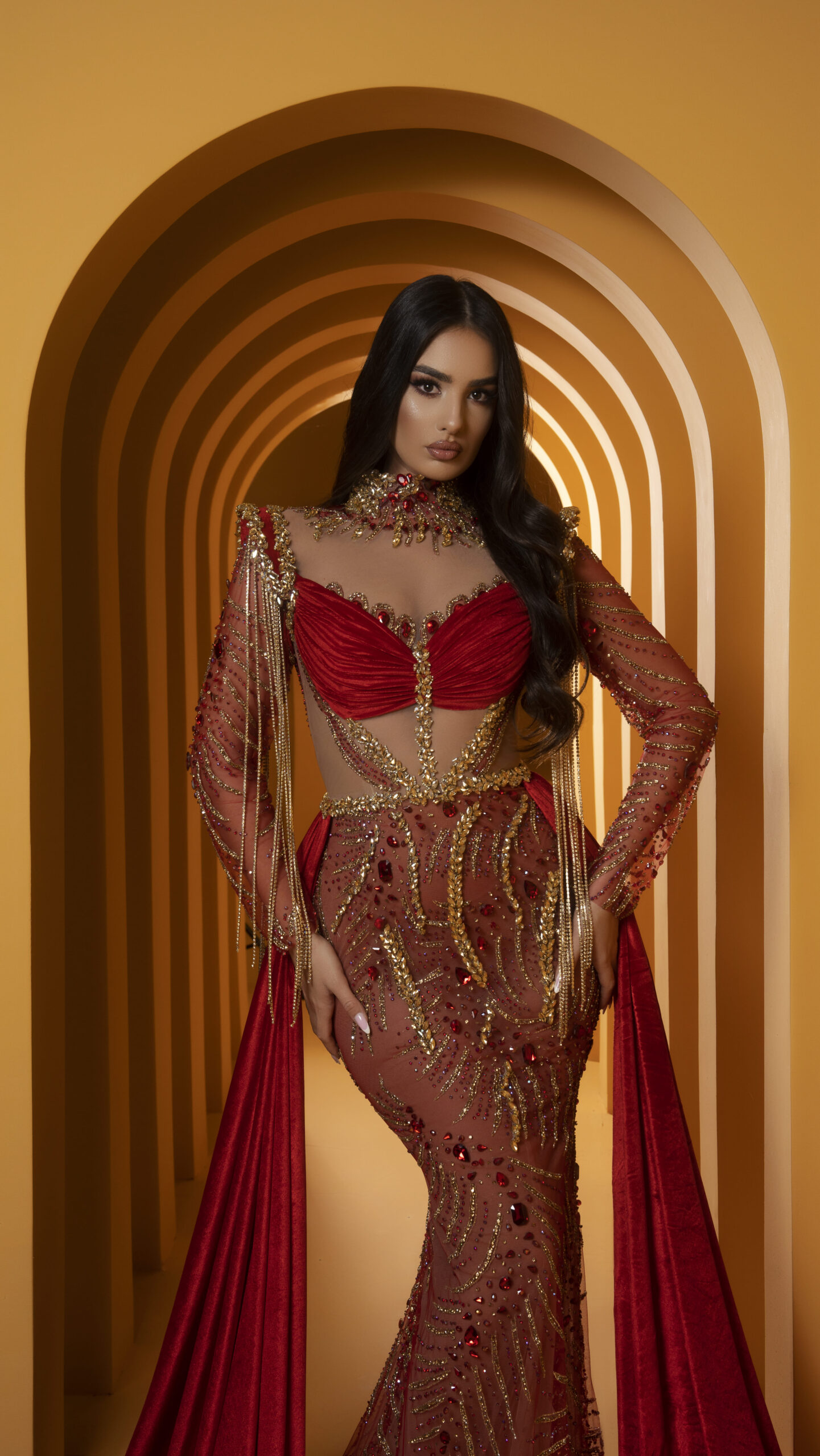 Luxury evening dress in red,with gold details,an elegant cut and a design that highlights the silhouette.Ideal for special events