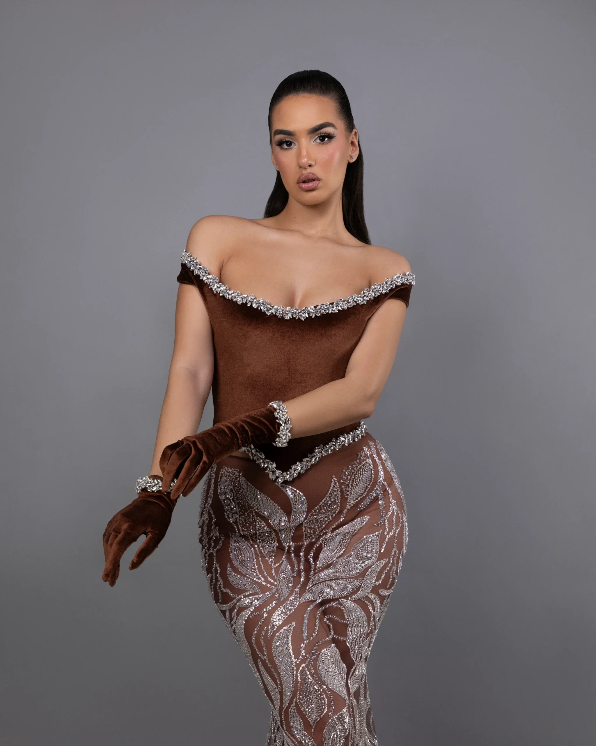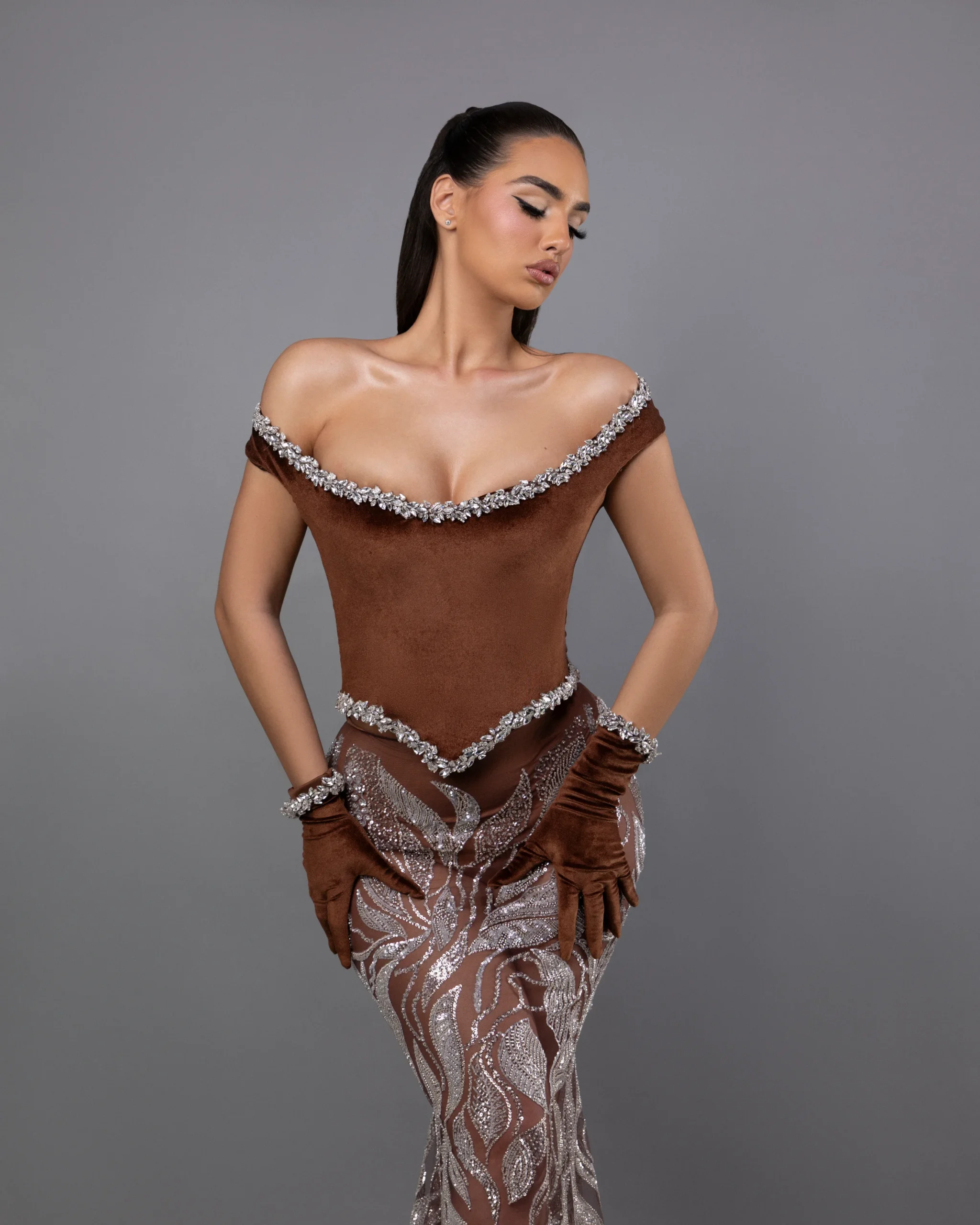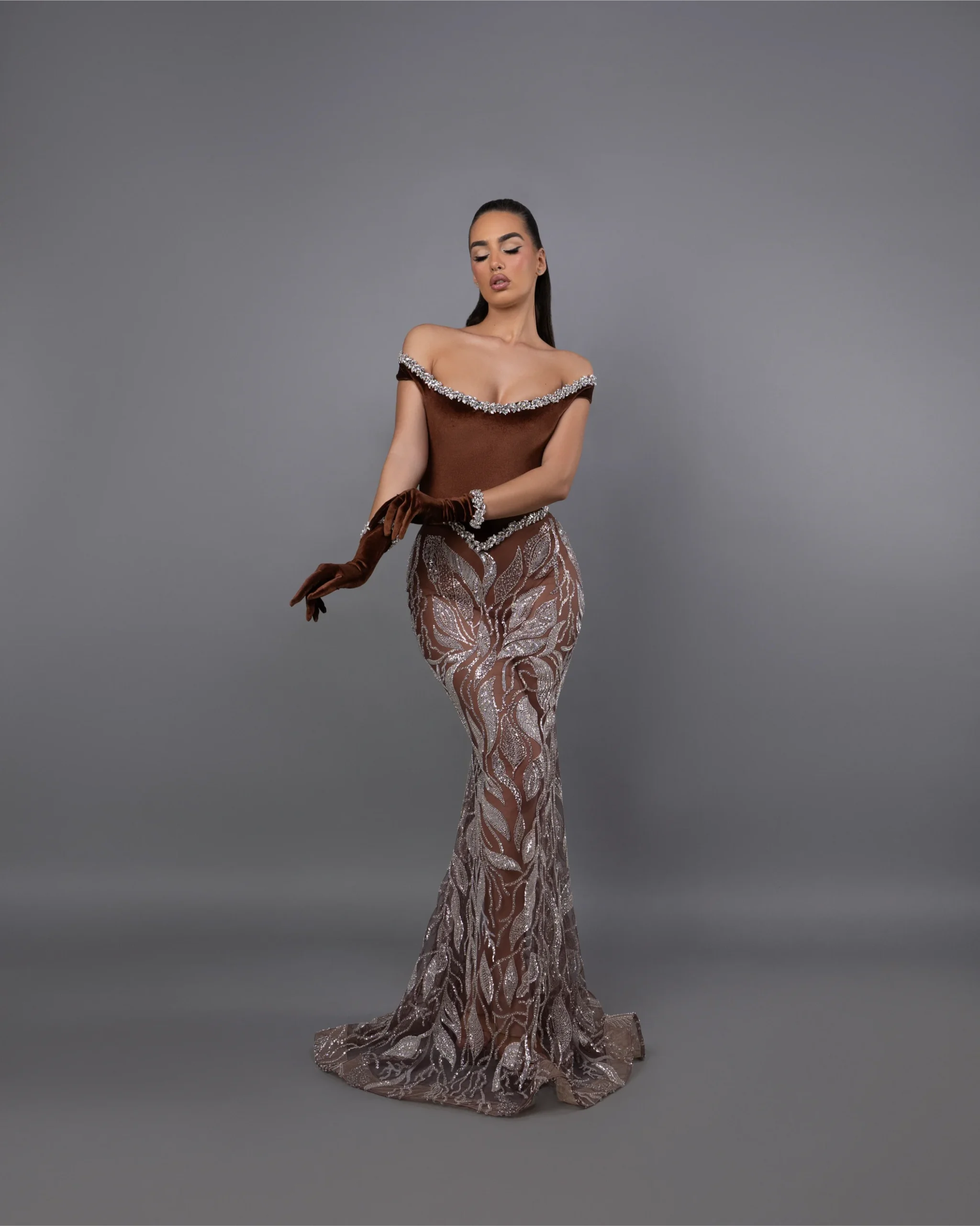 Long dress,Mermaid shape,brown color,Off-shoulder neckline,Matching velvet gloves with stones