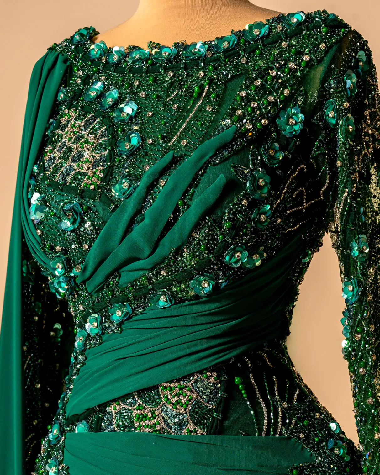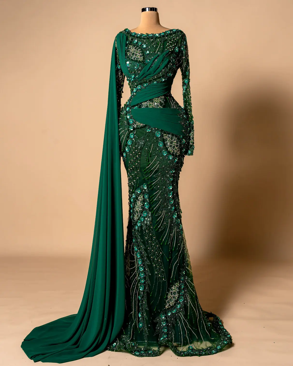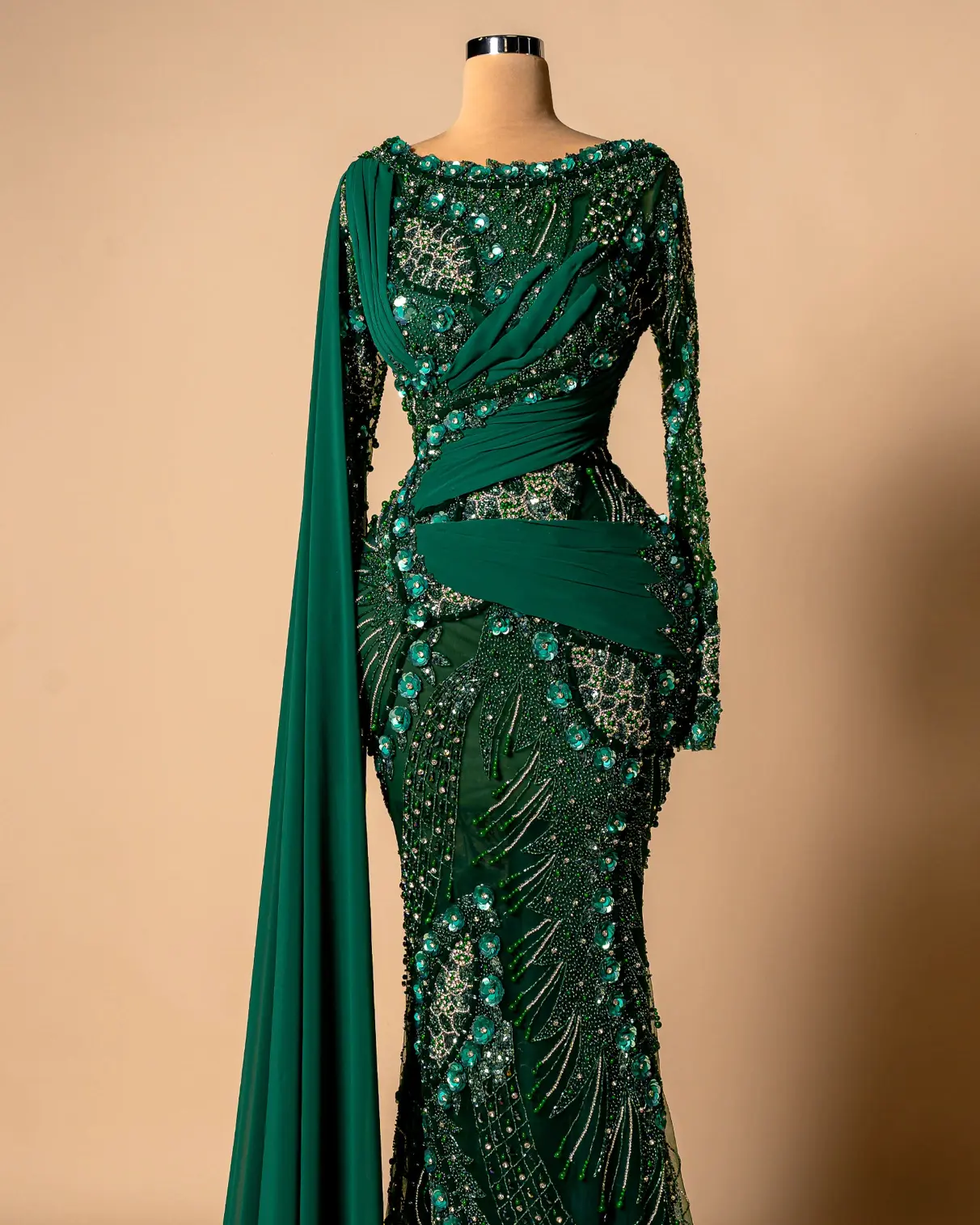 Formal evening gown with a mermaid silhouette,High neckline,One long sleeve and a one-shoulder design with a draped sash or cape,