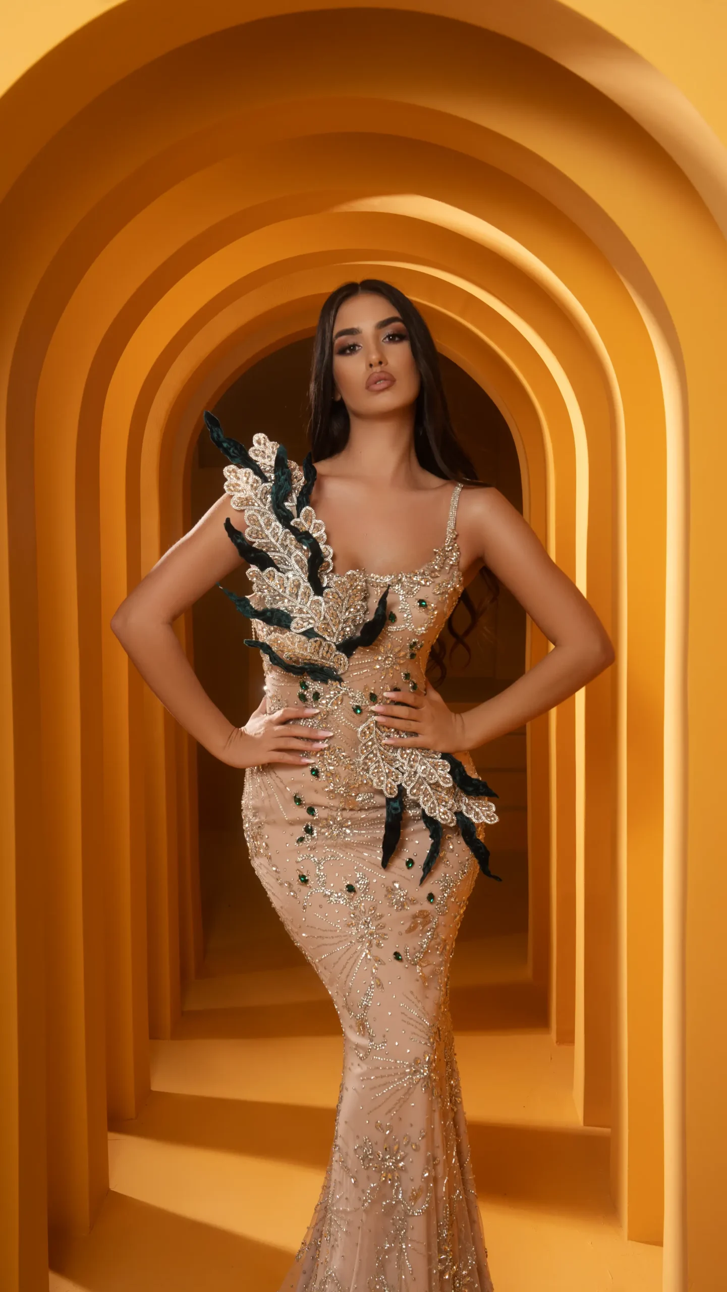 A nude dress that emphasizes the body, with some green leaves and a variety of stones that shine as much as the dress.