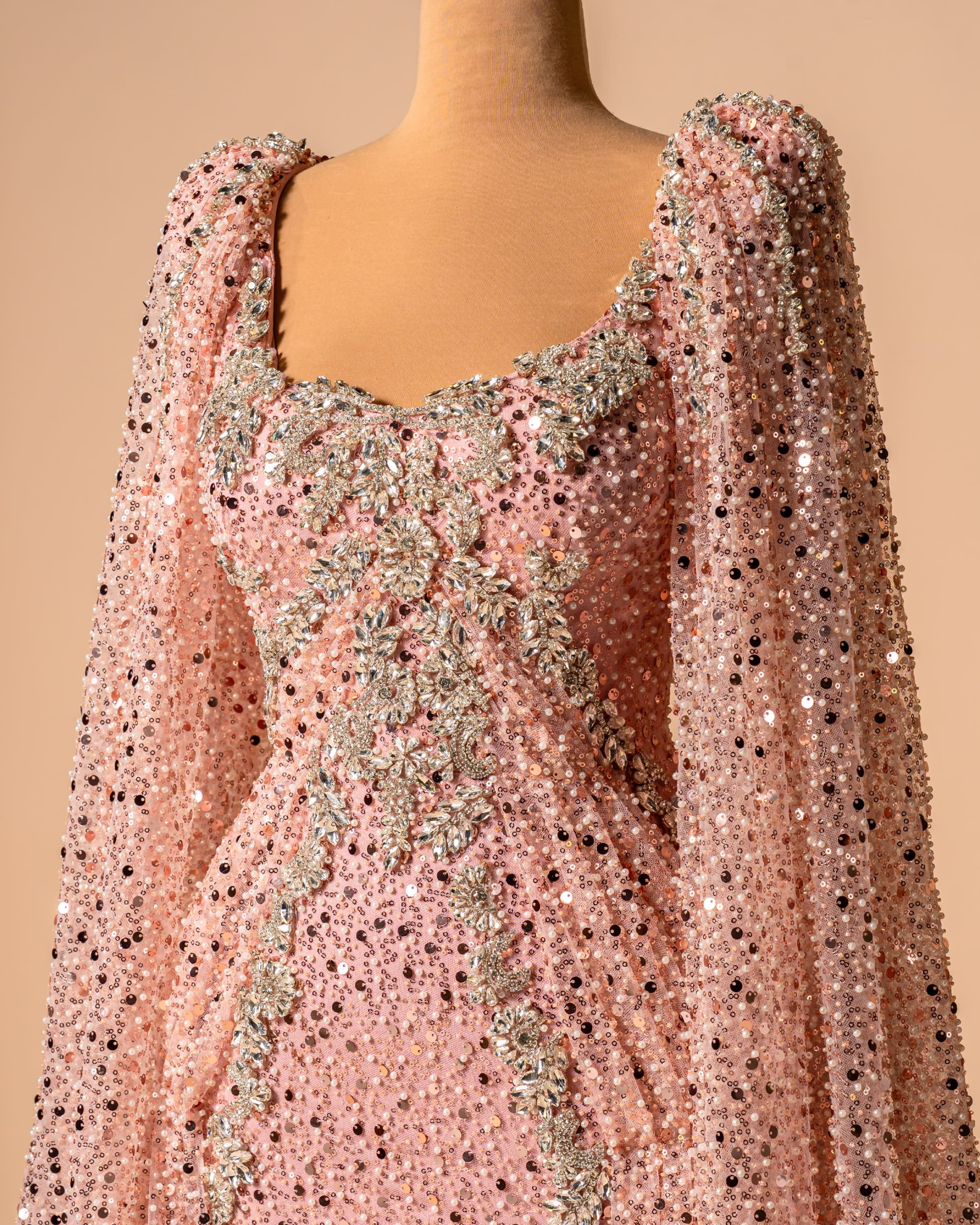 Beaded and sequins fabric, capes falling from shoulders and hips, sleeves, mermaid bottom.