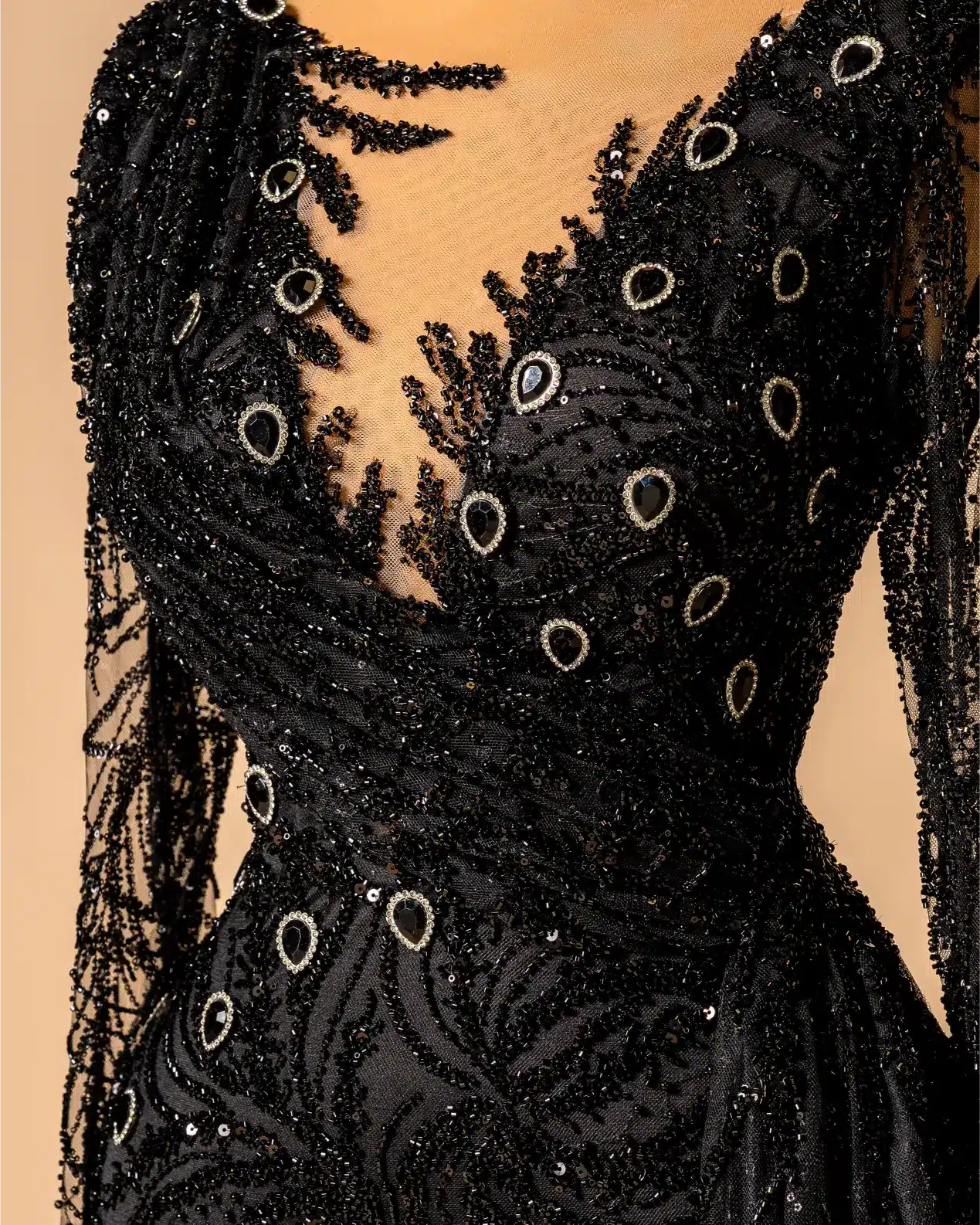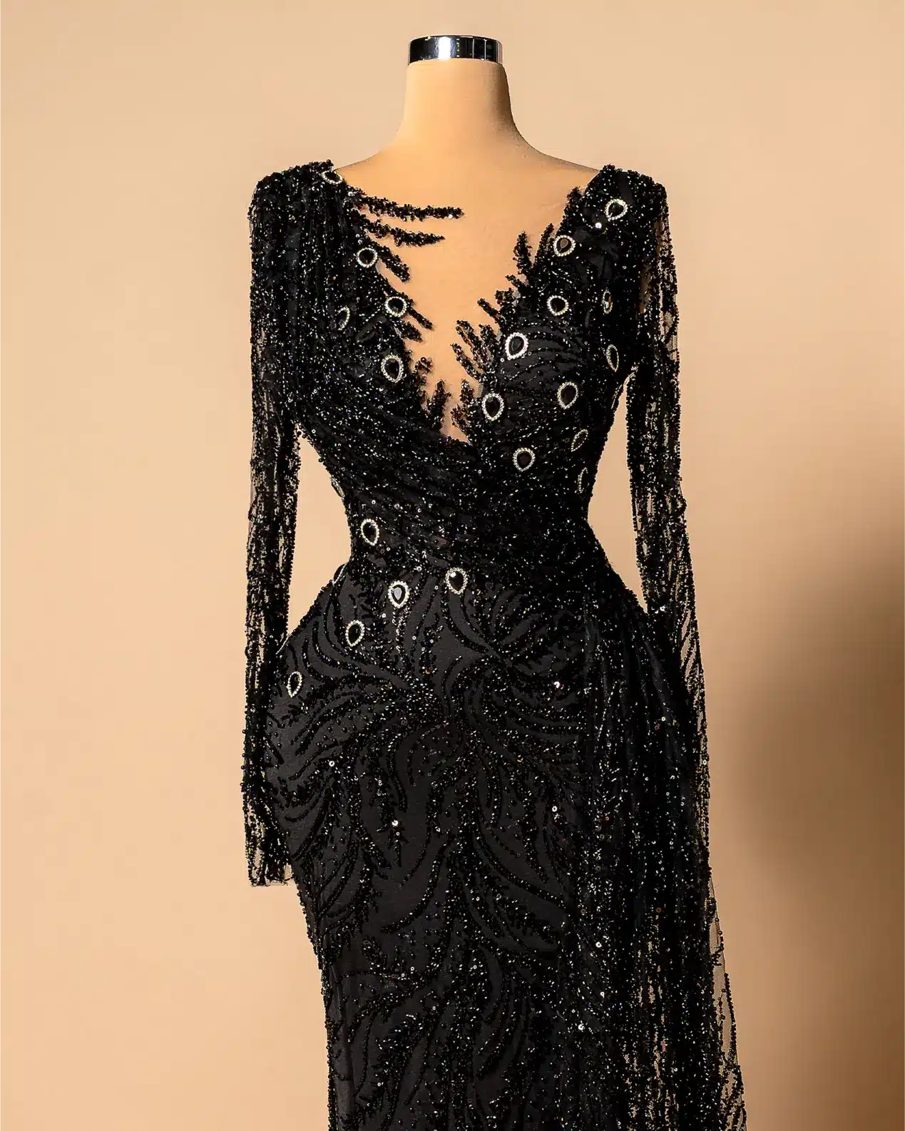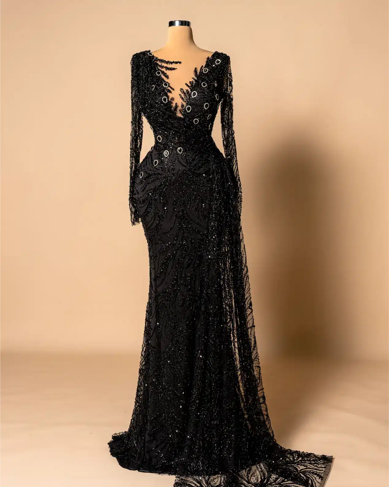 Mermaid or sheath silhouette with a sweeping train,Deep V-neckline with a sheer inset for coverage, Long sleeves, embellished sleeves,Embellishments, All-over beading, crystals, and sequins.