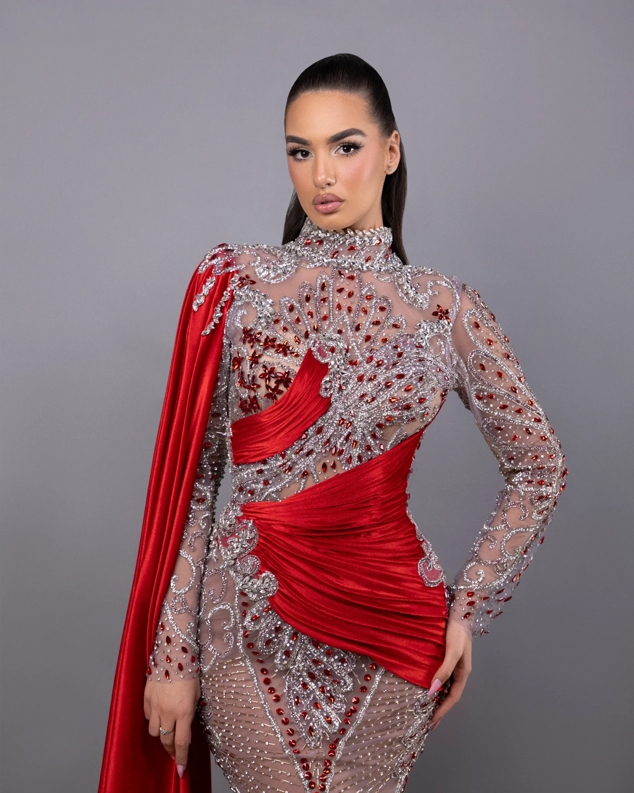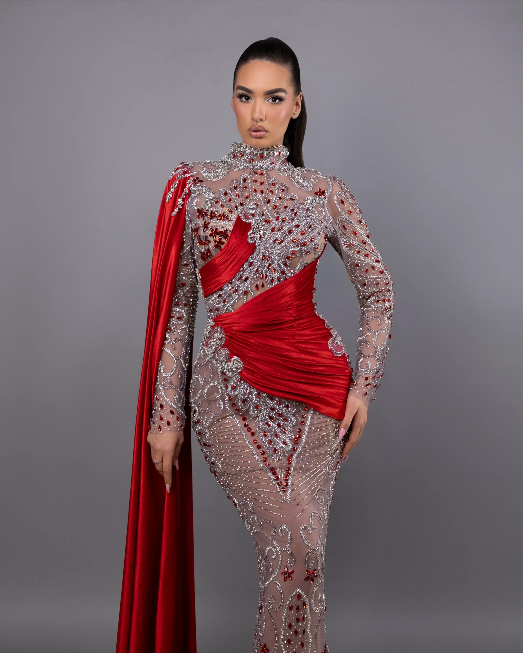 A stunning red and silver sheer gown crafted from mesh and georgette, adorned with intricate crystals and beading. The high neckline and long sleeves showcase elegance, while the fitted silhouette highlights the figure. Complete with a detachable or attached side cape, this gown offers dramatic flair and red-carpet sophistication