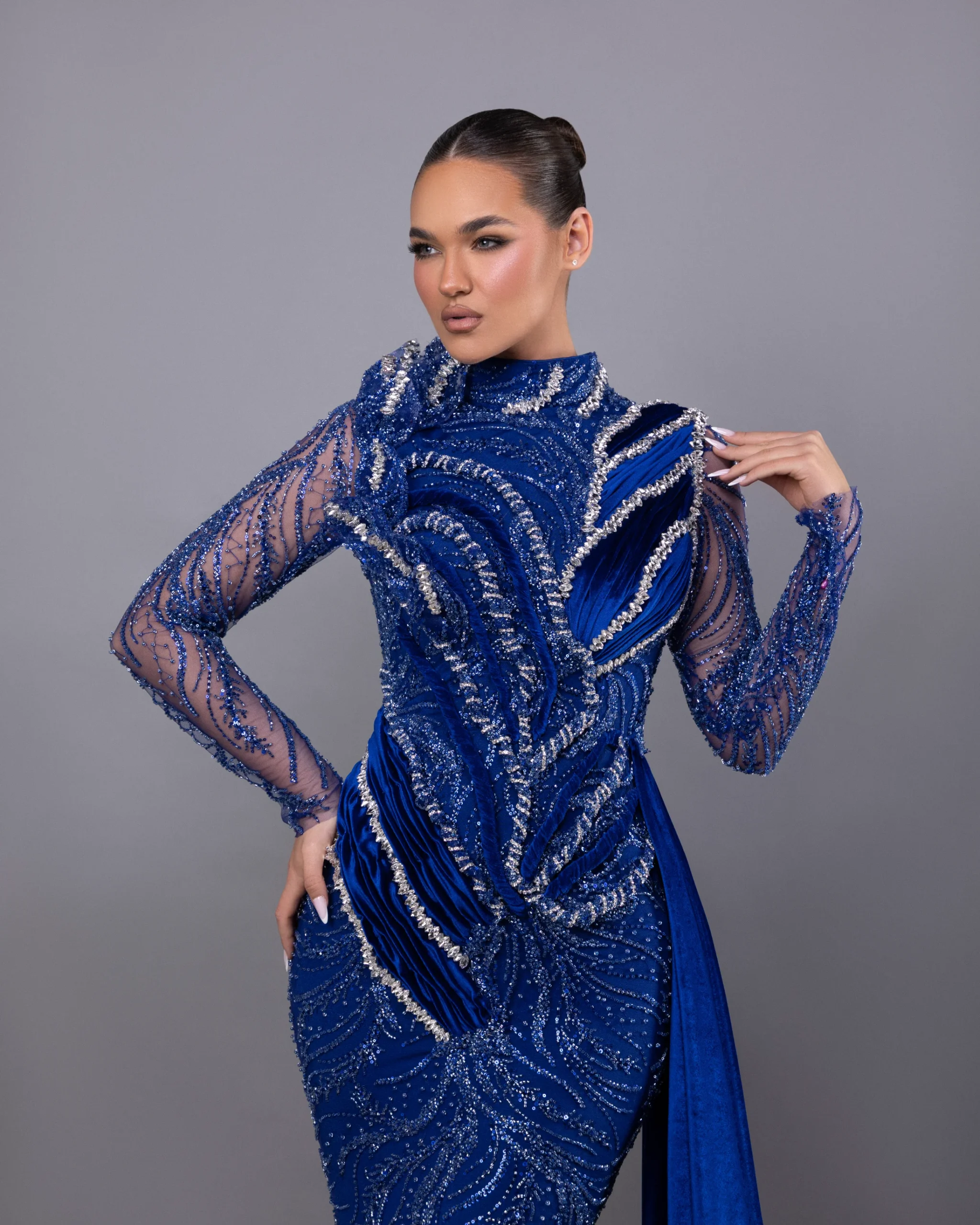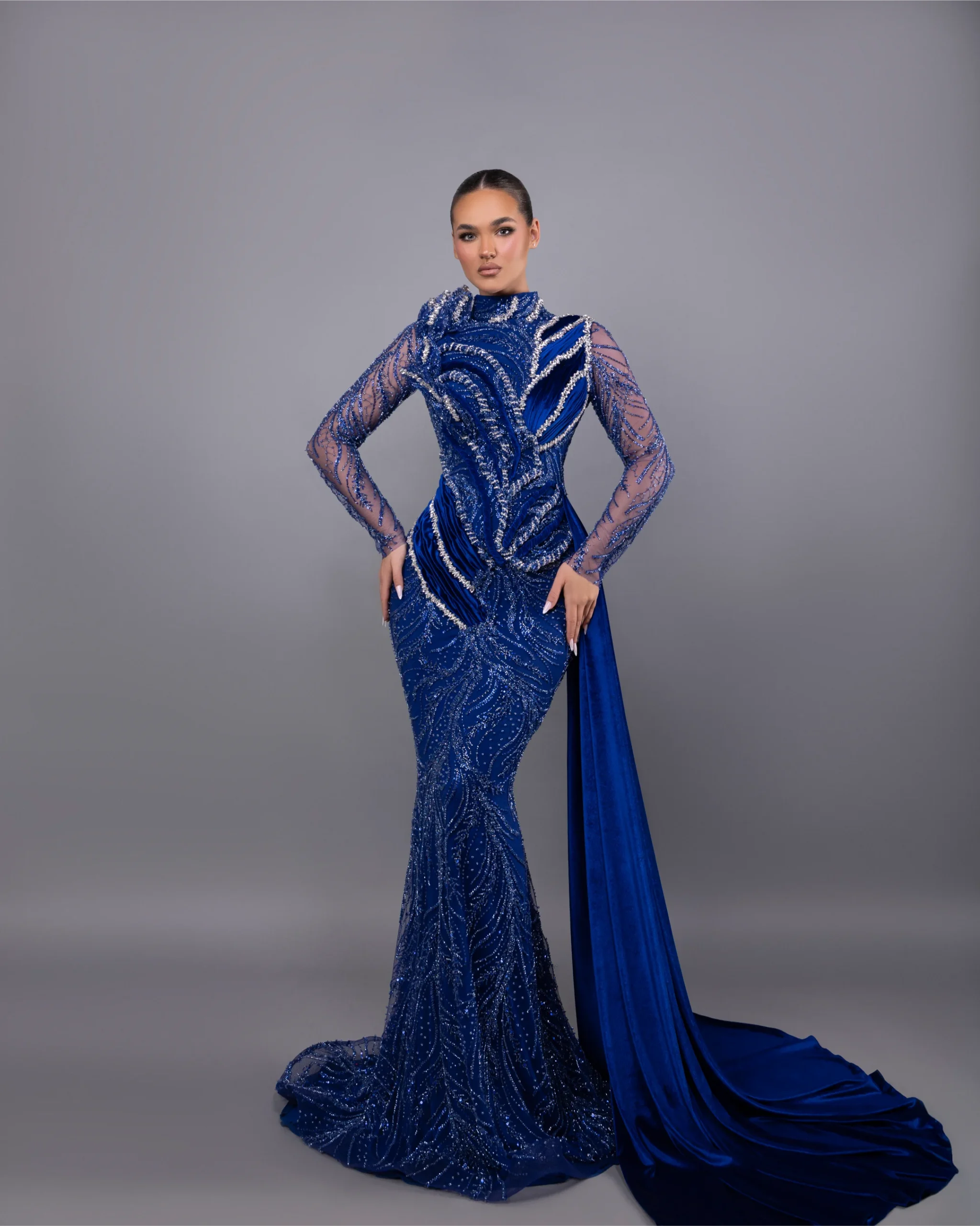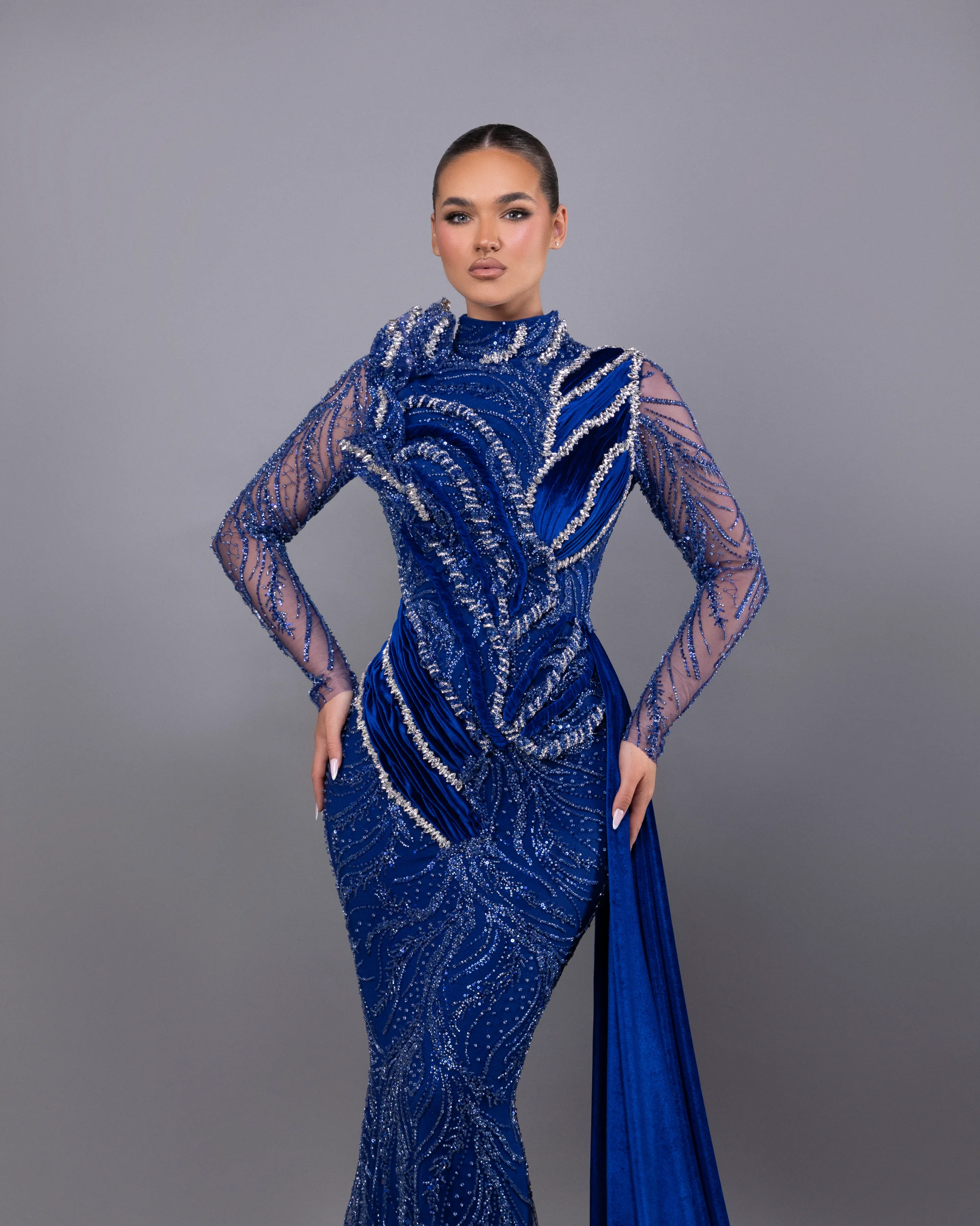 A dazzling mermaid gown featuring a high neckline and long sleeves, fully adorned with stones, beads, and sequined designs for all-over sparkle. The side skirt detail adds movement and drama, enhancing the fitted silhouette that gracefully flares at the hem
