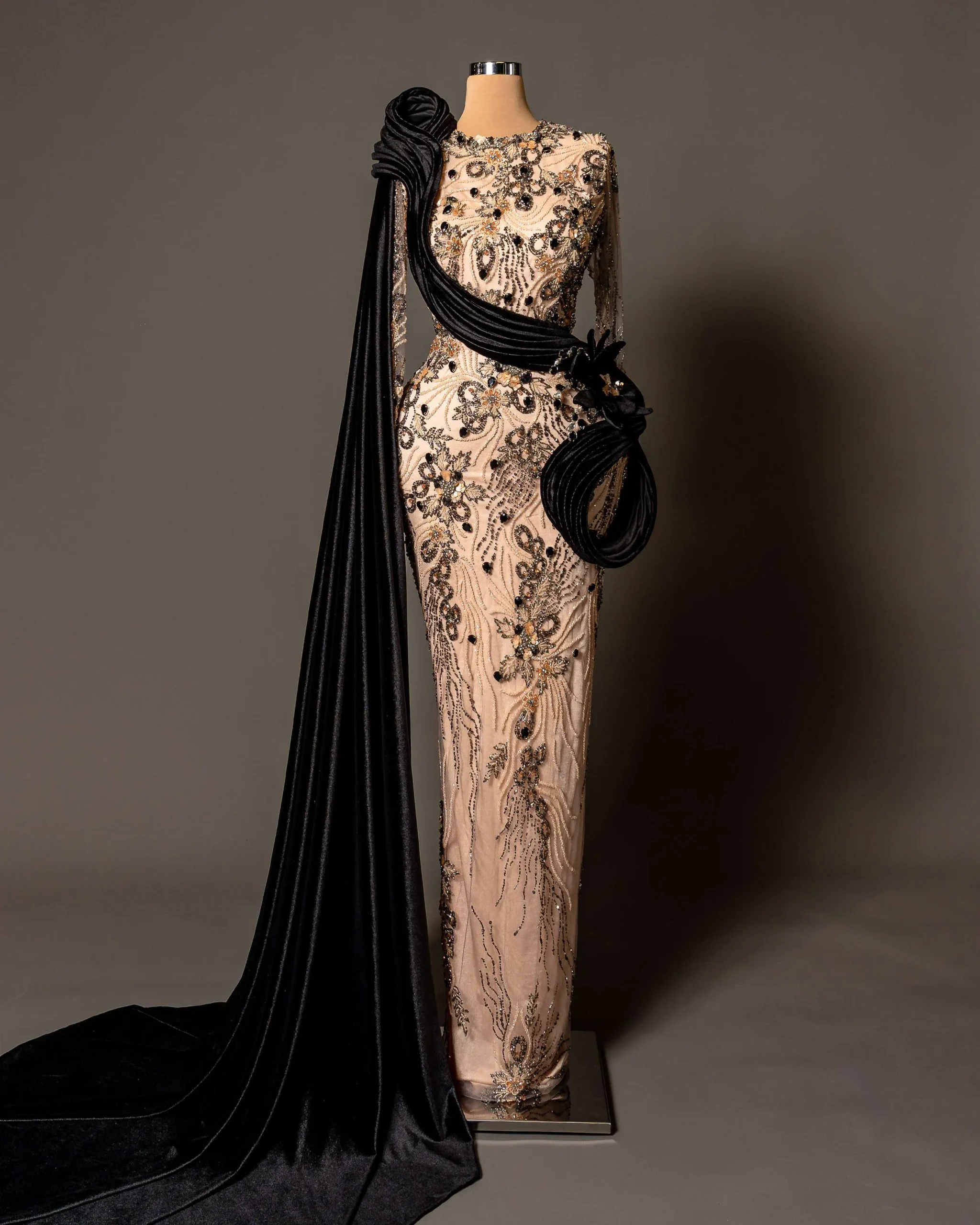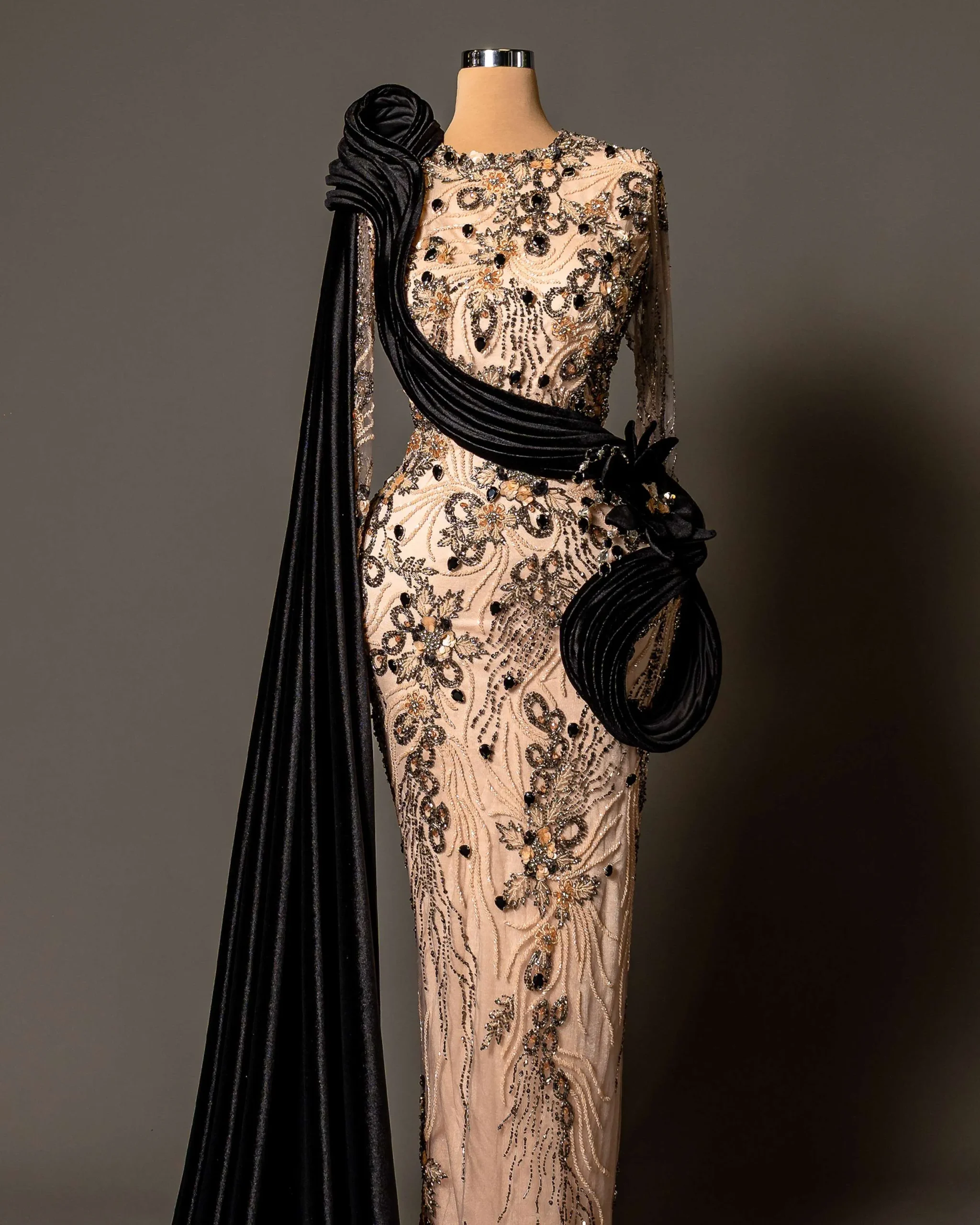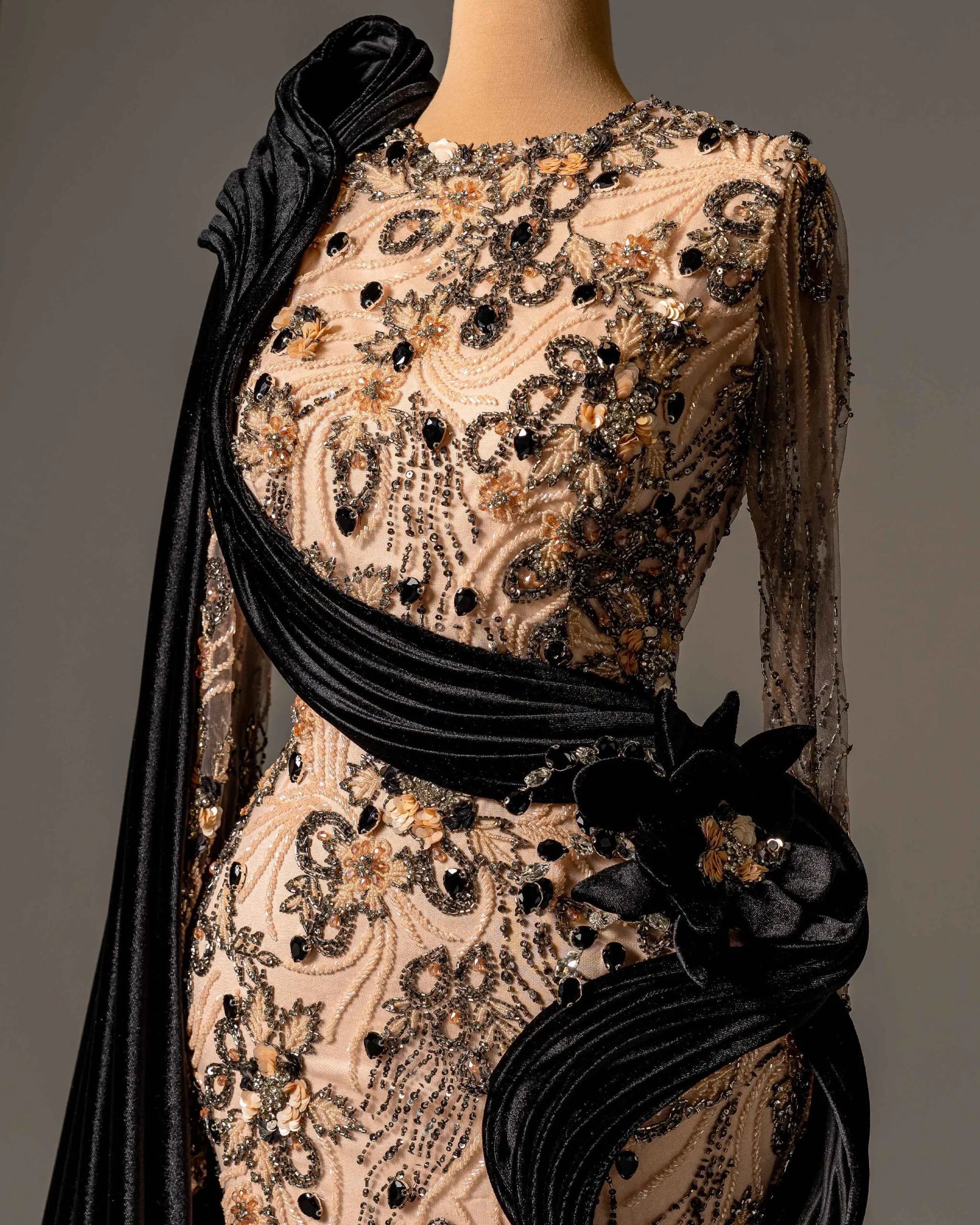 Playful velvet through the hips and shoulder, cape falling from the shoulder, handmande leafes with velvet, rhinestones fabric, straight fitted bottom, sleeves.