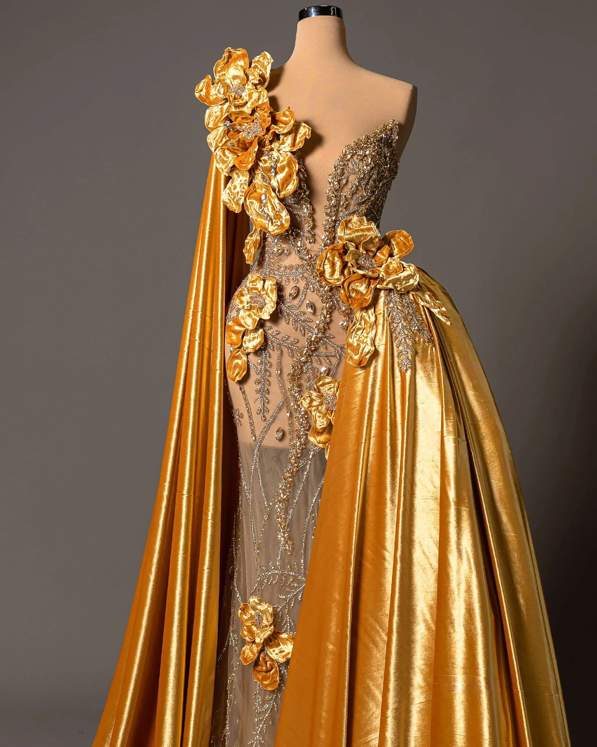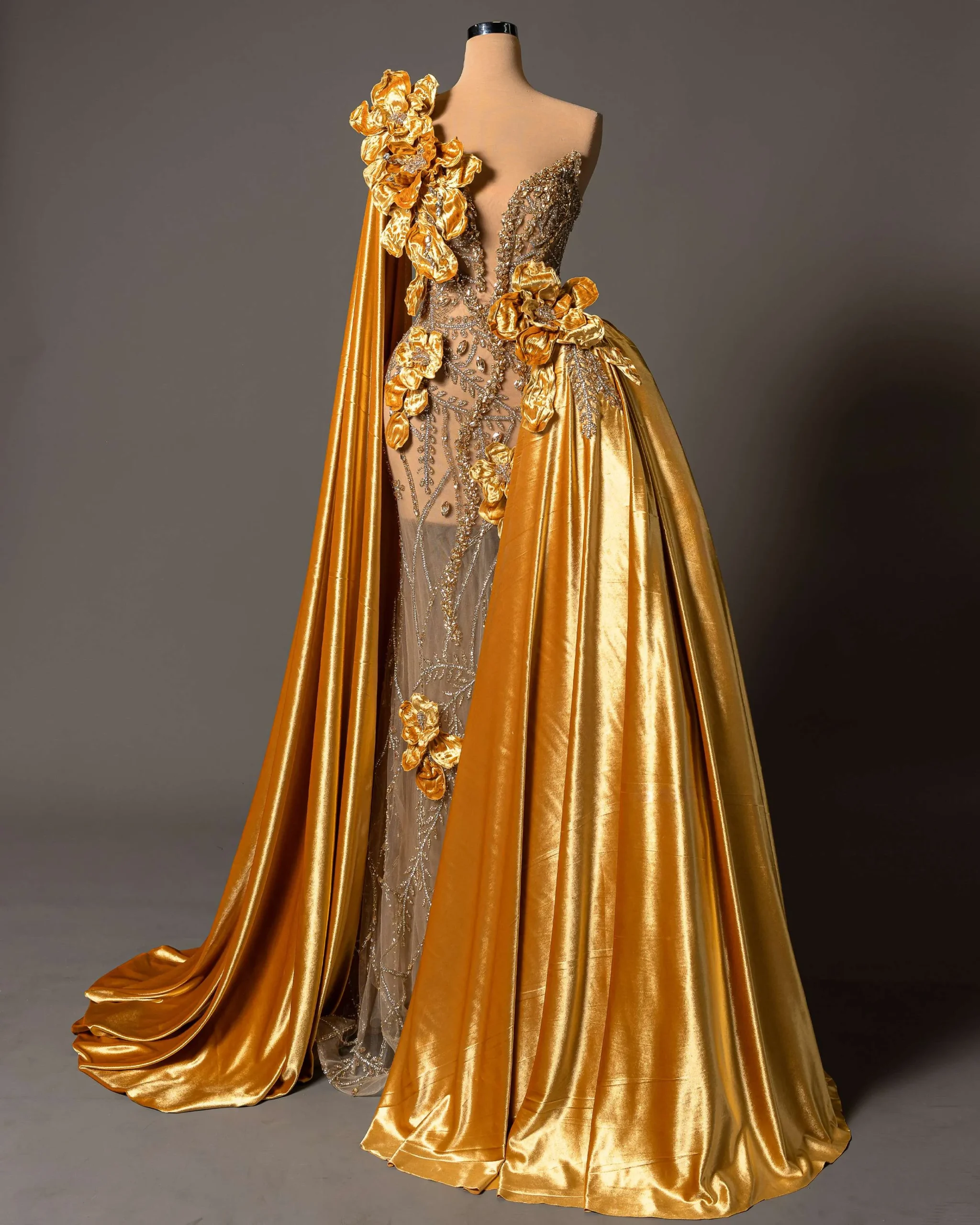 Handcrafted 3D floral appliqués in metallic gold tones,Luxurious velvet drape with a dramatic train,Sheer illusion bodice adorned with intricate beadwork and crystals,Asymmetric design combining elegance and bold femininity