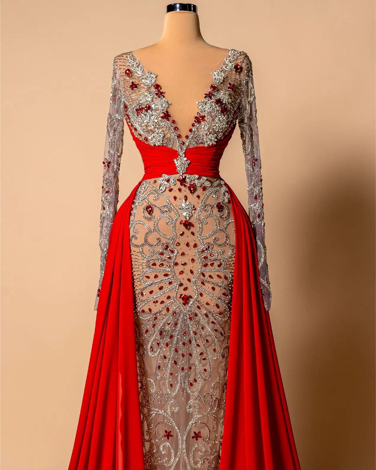 Red & Silver, Mesh, georgette, Crystals & Beading,Fitted sheer gown with detachable/attached side skirt ,Neckline: Deep V plunging neckline Long sleeves with embellishments