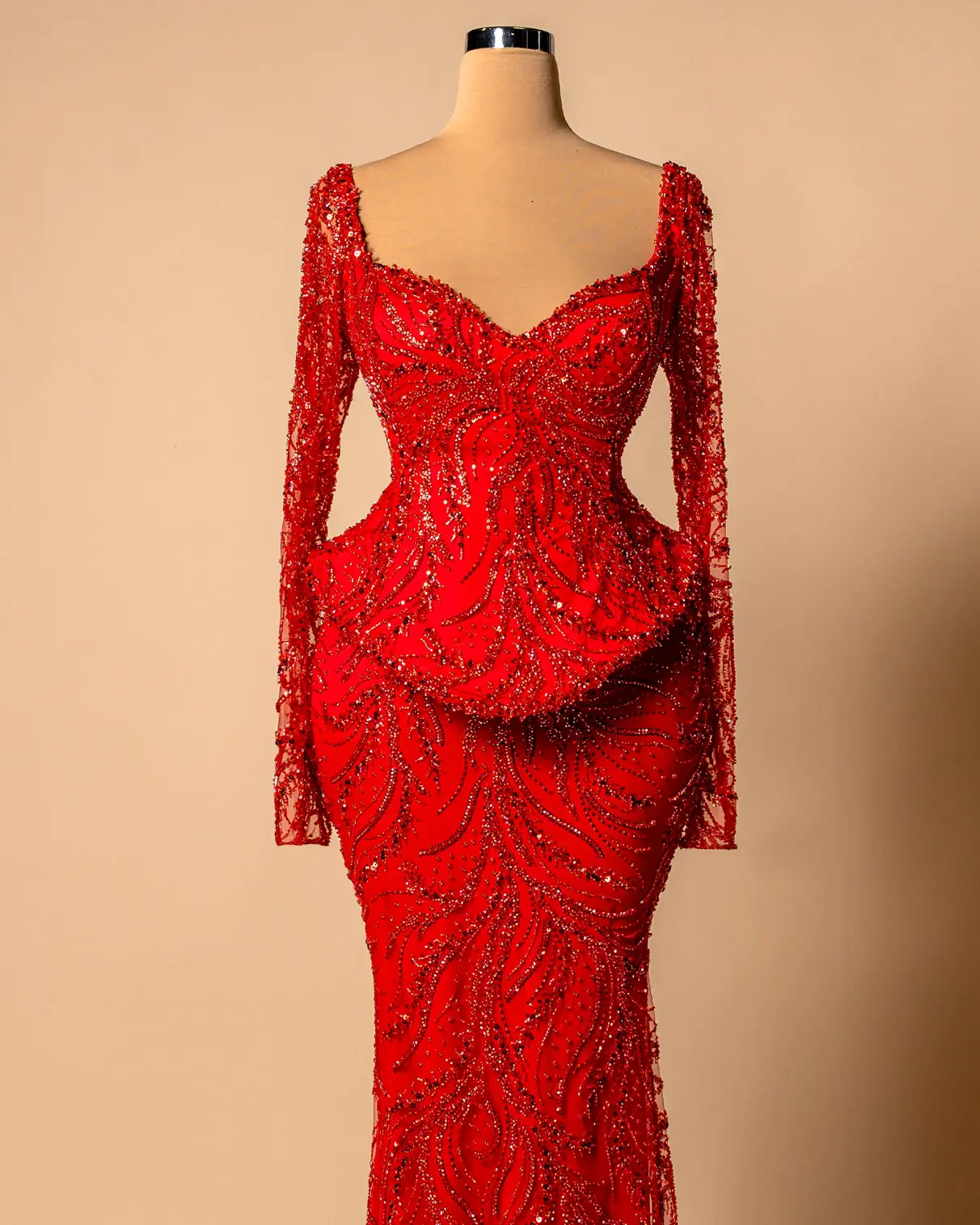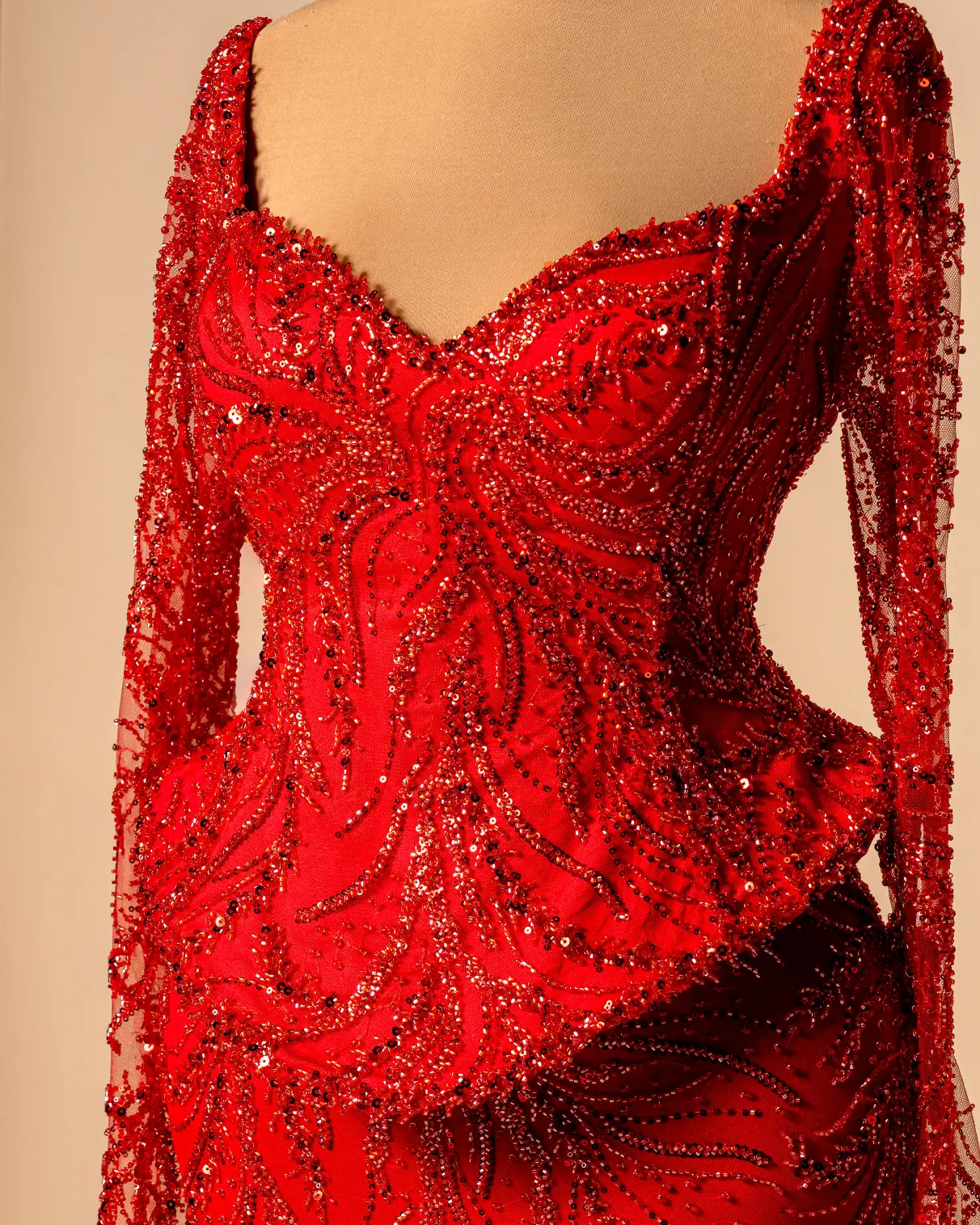 Red beaded fabric, structured shaping corset, sleeves, mermaid bottom, soft heart-shaped corset.