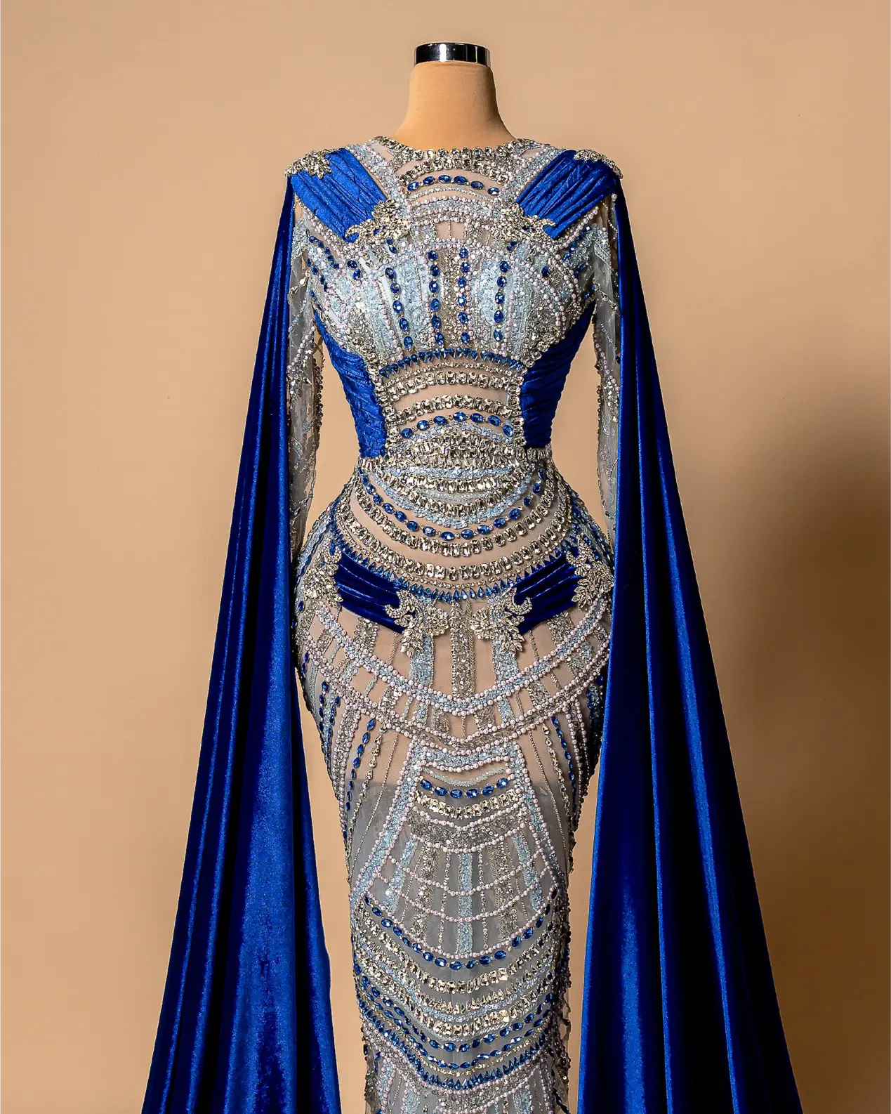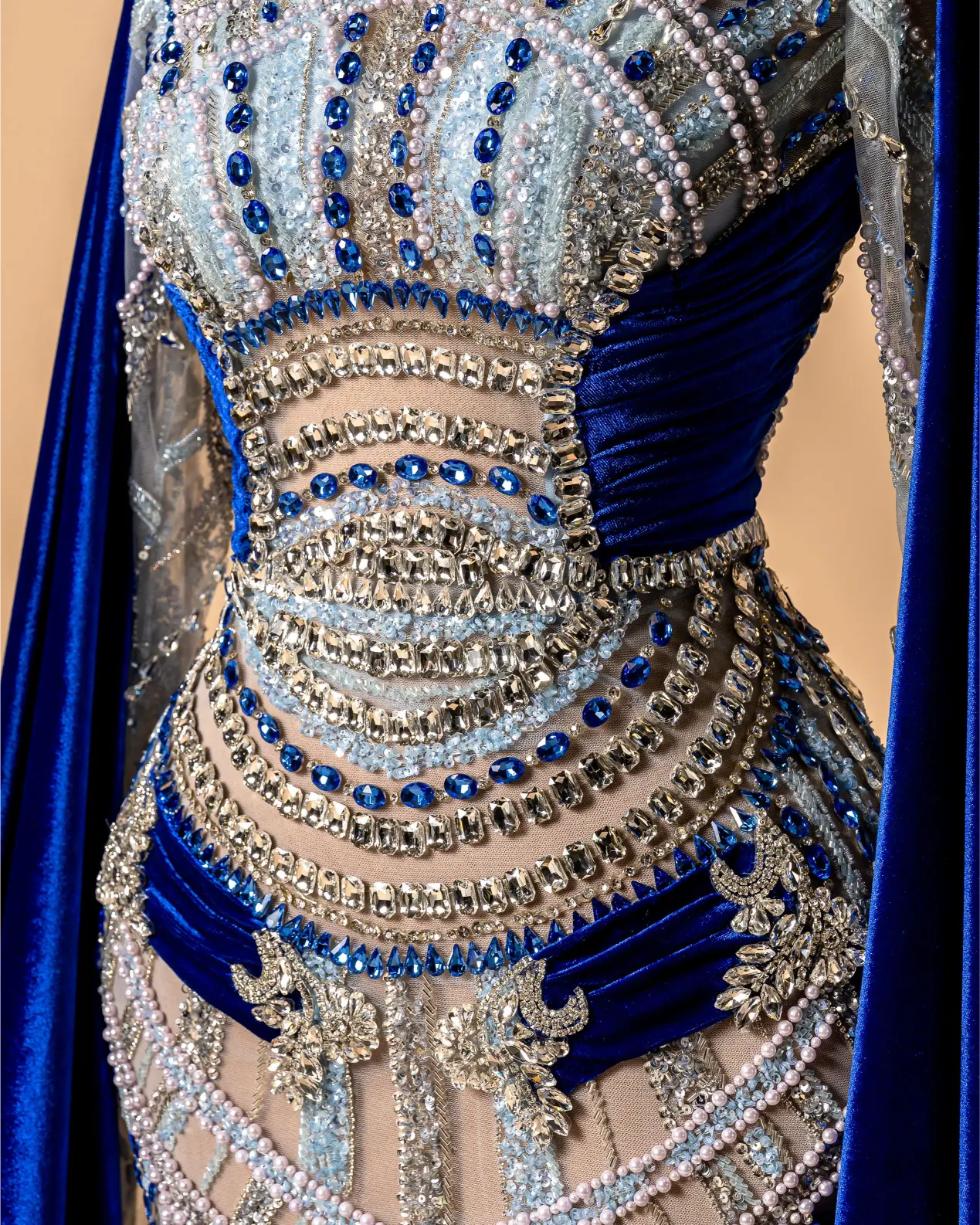 Color: Royal Blue & Silver Material: Velvet, Mesh, Crystals & Beading Design: Full-length fitted mermaid gown with attached cape Neckline: High neck Sleeves: Sleeveless (cape attachment)Closure: Back zipper