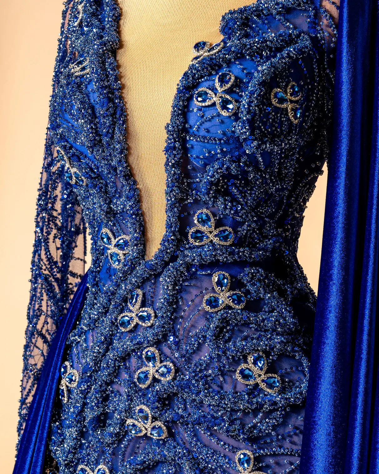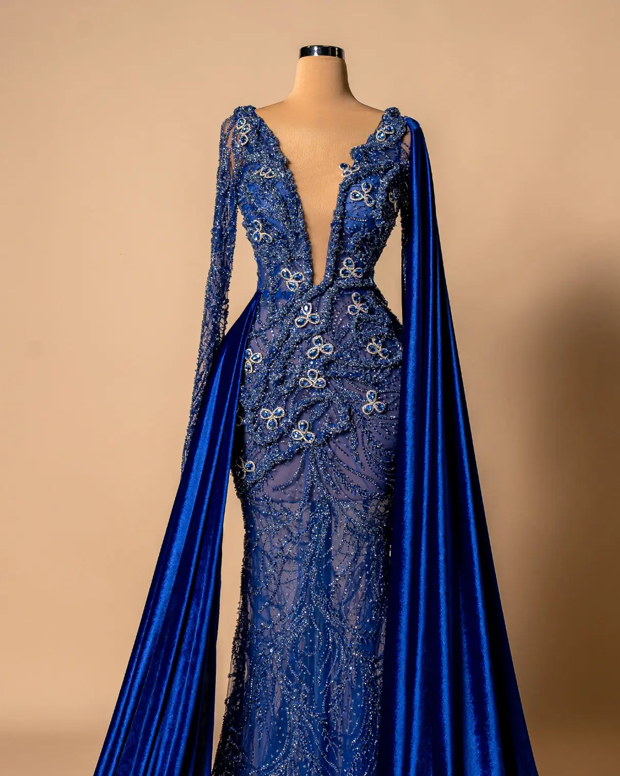 Mermaid silhouette with a deep V-neck and a train, Long, embellished sleeves with two attached flowing cape-like trains,Embellishments: Beaded and sequined designs across the entirety of the dress