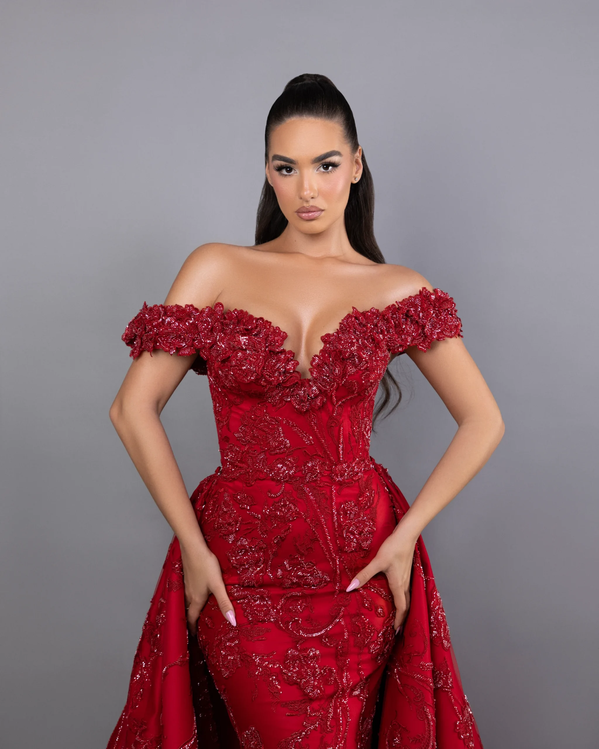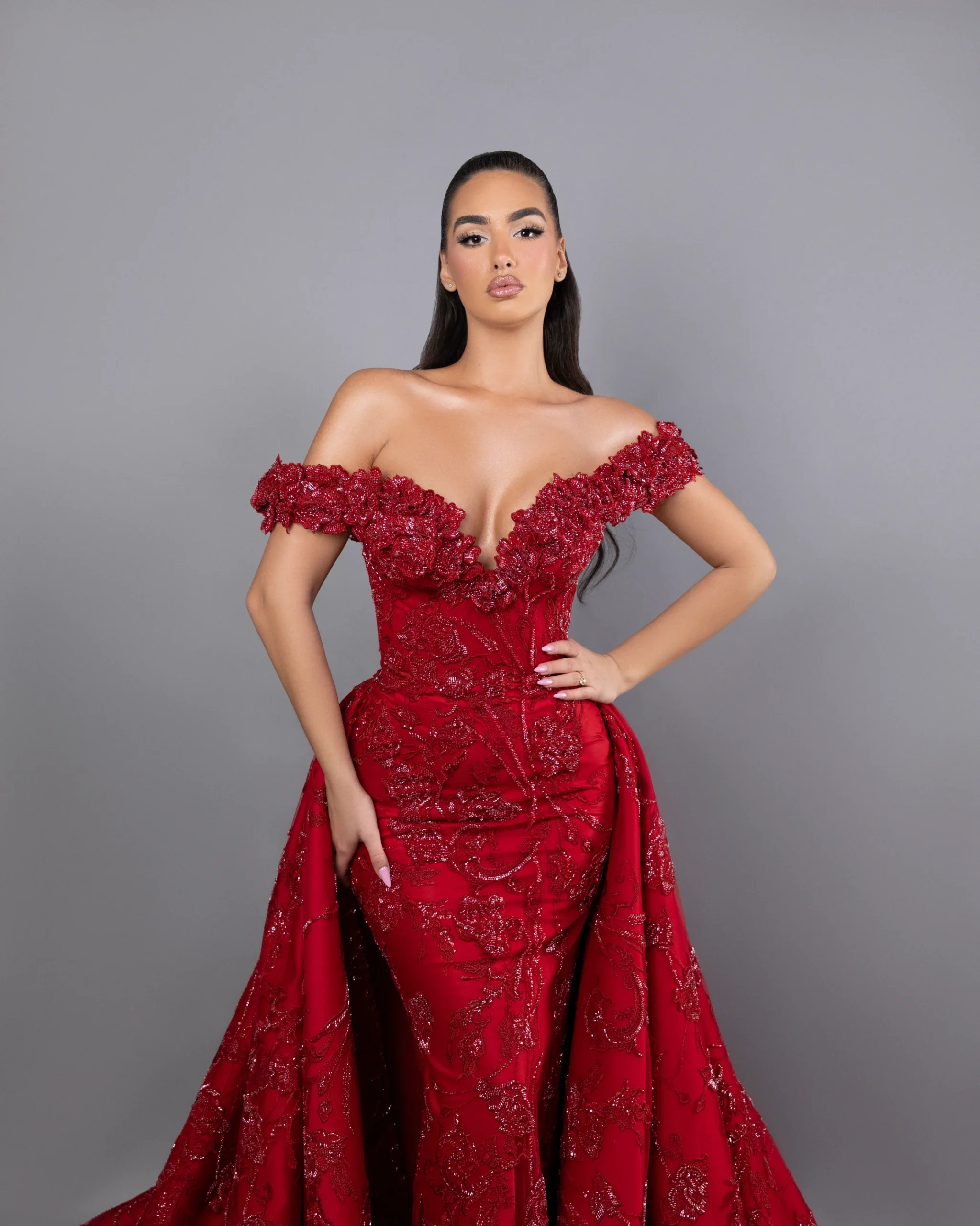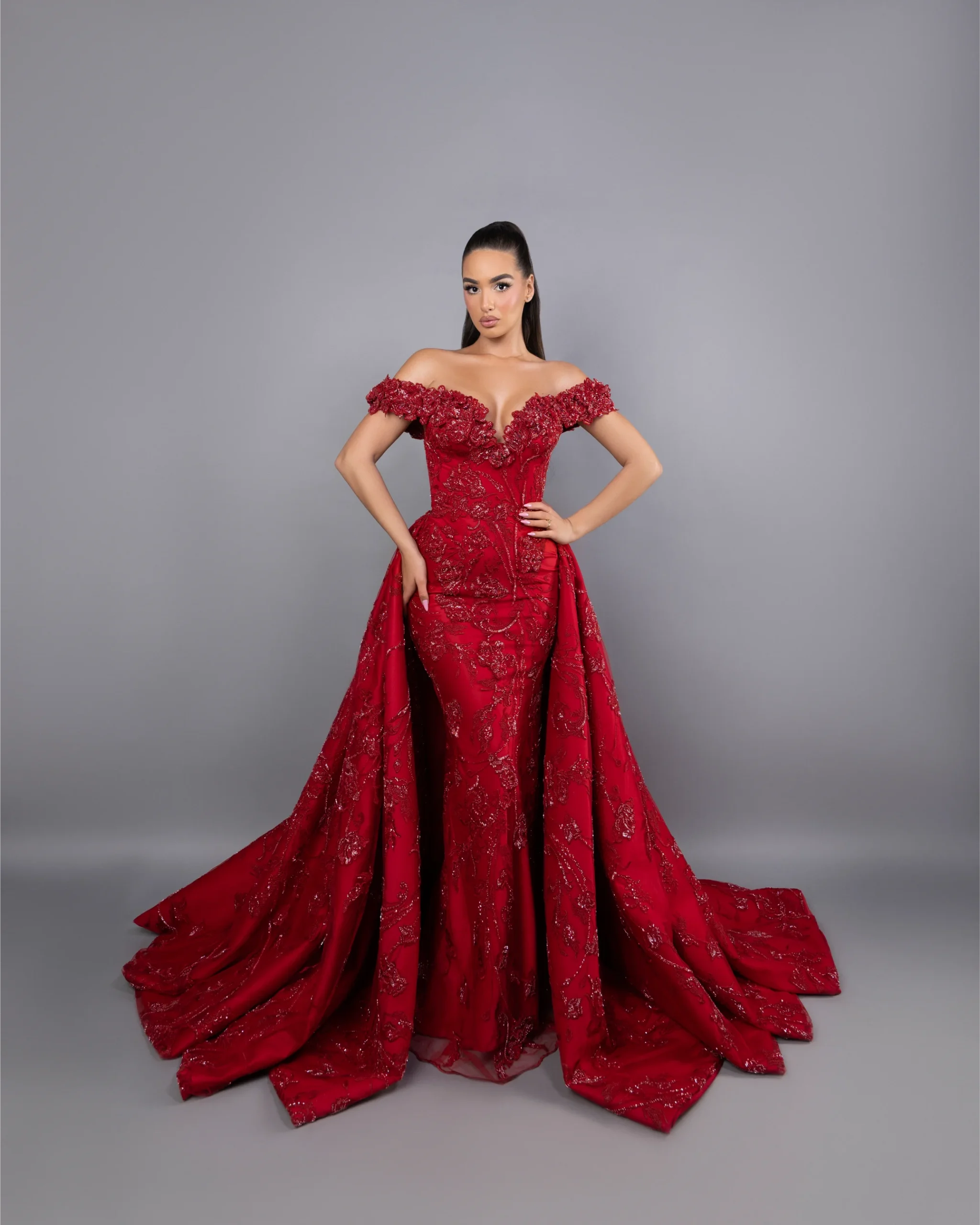 Elegant red off-shoulder gown with lace embellishments and a dramatic train.