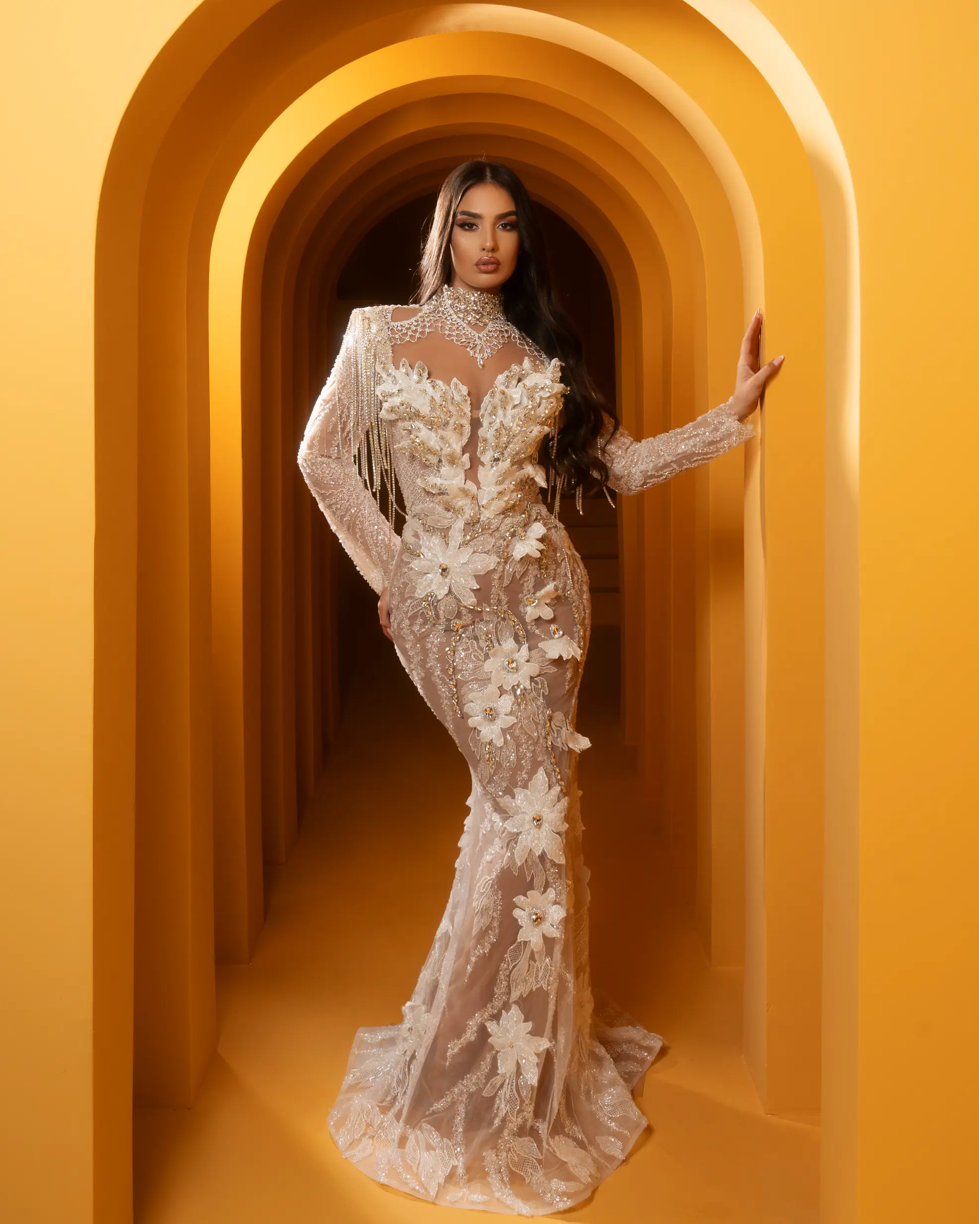 A couture evening gown that defines luxury and confidence. With its intricate white embellishments and flawless silhouette, “white aura” is designed for gala nights, red carpet moments, and unforgettable entrances.