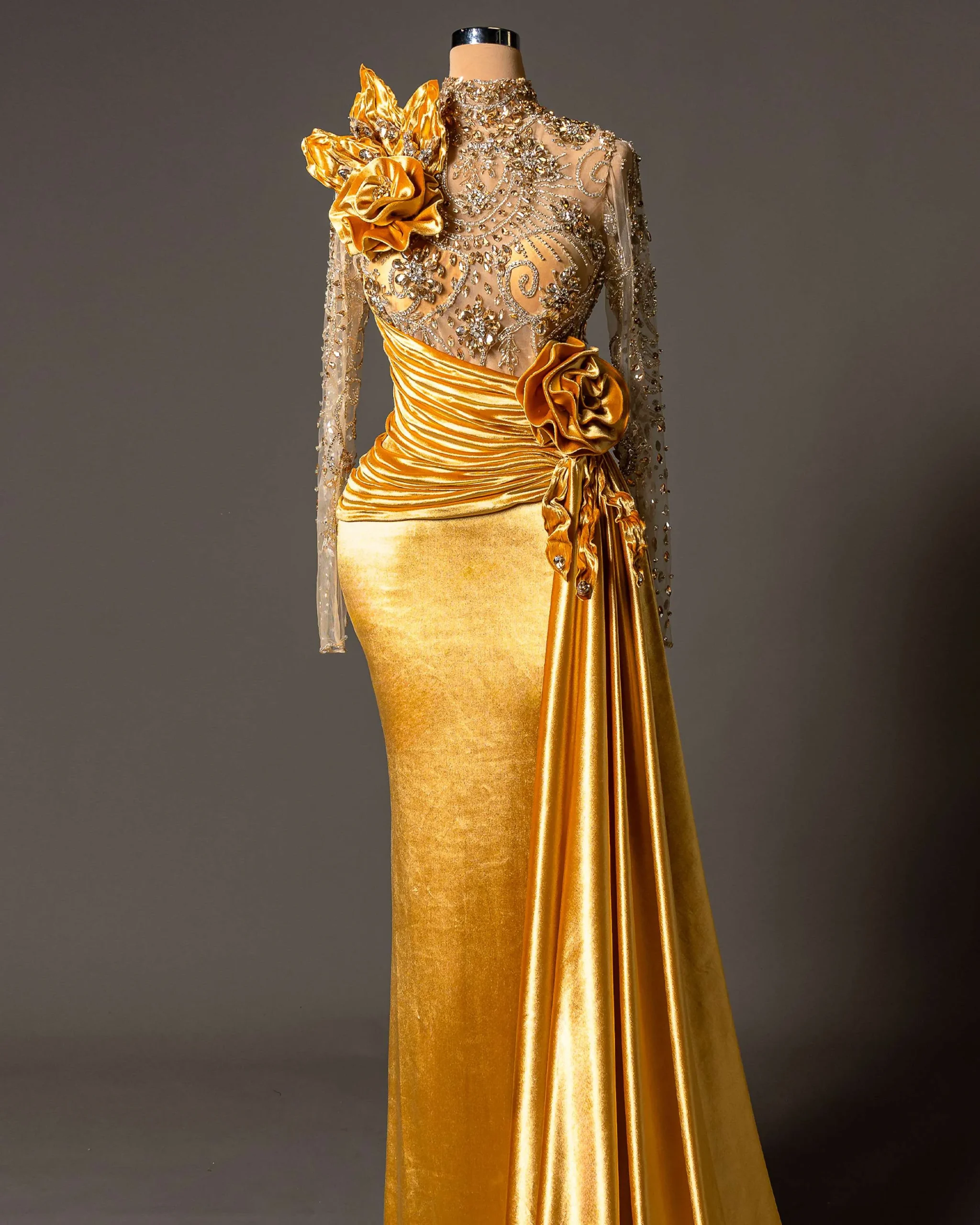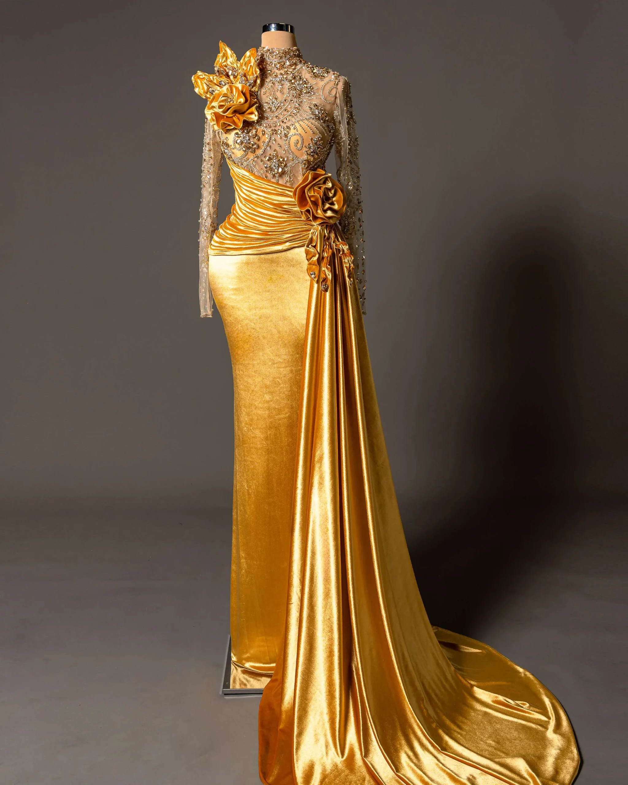 Hand-embroidered crystal detailing,3D floral appliqués on shoulder and waist,Lustrous gold velvet with elegant draping,Fitted silhouette with flowing train